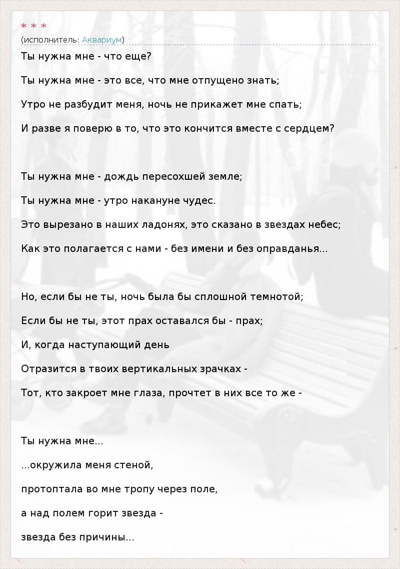 Это интересно:«Аквариум» — группа, стоявшая и стоящая у истоков рока в СССР. Основана Борисом Гребенщиковым (БГ) и его другом Анатолием Гуницким (он же Джордж, Старый Рокер) в июле 1972 года в Ленинграде.«Аквариум» был основан как постмодернистский поэтически-музыкальный проект. Тридцать лет спустя БГ так охарактеризует этот проект:"У меня простой подход. Боб Марли говорил: «Who are playing... продолжение
