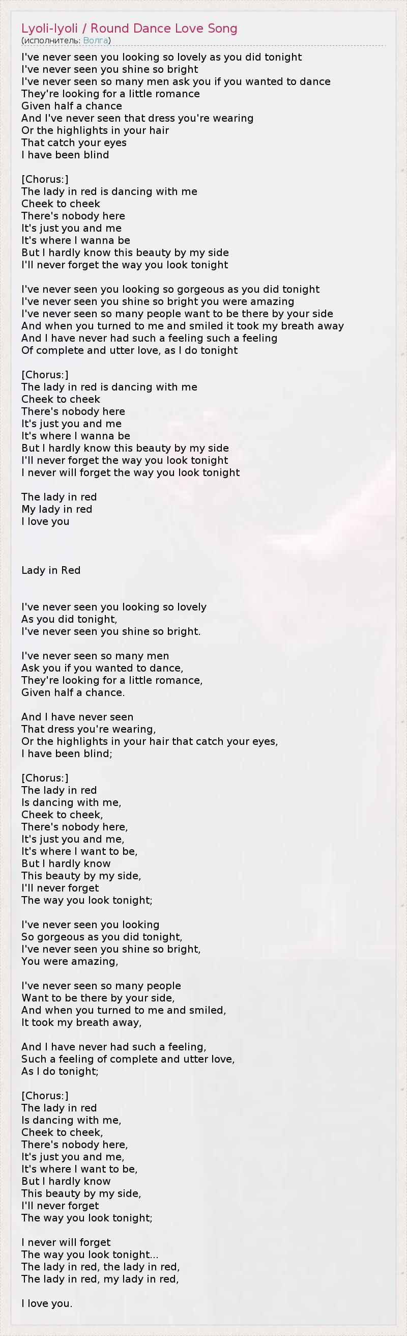 I've never seen you looking so lovely as you did tonight I've never seen you shine so bright I've never seen so many men ask you if you wanted to dance They're looking for a little romance Given half a chance And I've never seen that dress you're wearing Or the highlights in your hair That catch your eyes I have been blind [Chorus:] The lady in red is dancing with me Cheek to cheek There's nobody here It's just you and me It's where I wanna be But I hardly know this beauty by my side I'll never forget the way you look tonight I've never seen you looking so gorgeous as you did tonight I've never seen you shine so bright you were amazing I've never seen so many people want to be there by your side And when you turned to me and smiled it took my breath away And I have never had such a feeling such a feeling Of complete and utter love, as I do tonight [Chorus:] The lady in red is dancing with me Cheek to cheek There's nobody here It's just you and me It's where I wanna be But I hardly know this beauty by my side I'll never forget the way you look tonight I never will forget the way you look tonight The lady in red My lady in red I love you Lady in Red I've never seen you looking so lovely As you did tonight, I've never seen you shine so bright. I've never seen so many men Ask you if you wanted to dance, They're looking for a little romance, Given half a chance. And I have never seen That dress you're wearing, Or the highlights in your hair that catch your eyes, I have been blind; [Chorus:] The lady in red Is dancing with me, Cheek to cheek, There's nobody here, It's just you and me, It's where I want to be, But I hardly know This beauty by my side, I'll never forget The way you look tonight; I've never seen you looking So gorgeous as you did tonight, I've never seen you shine so bright, You were amazing, I've never seen so many people Want to be there by your side, And when you turned to me and smiled, It took my breath away, And I have never had such a feeling, Such a feeling of complete and utter love, As I do tonight; [Chorus:] The lady in red Is dancing with me, Cheek to cheek, There's nobody here, It's just you and me, It's where I want to be, But I hardly know This beauty by my side, I'll never forget The way you look tonight; I never will forget The way you look tonight... The lady in red, the lady in red, The lady in red, my lady in red, I love you.