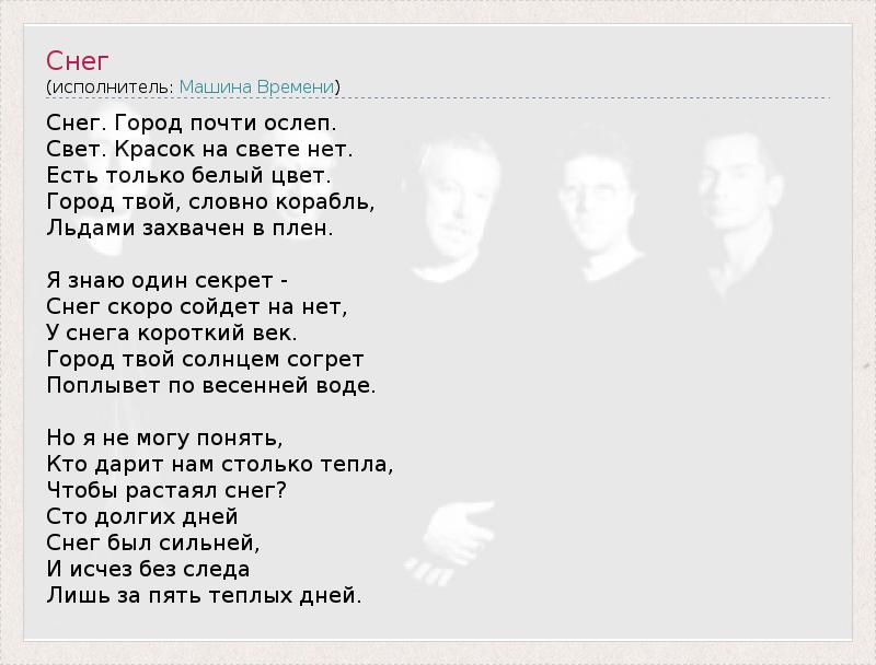 Это интересно:Москва - город государственный, и близость к наковальням власти преисполняла молодых искателей истины идти в официальные инстанции и убеждать эти инстанции, что играемая ими - молодыми - музыка нужна и полезна народу. Это забирало столько времени и сил, что собственно на писание песен сил уже оставалось не так много. Машина Времени - исключение. «Машина... продолжение