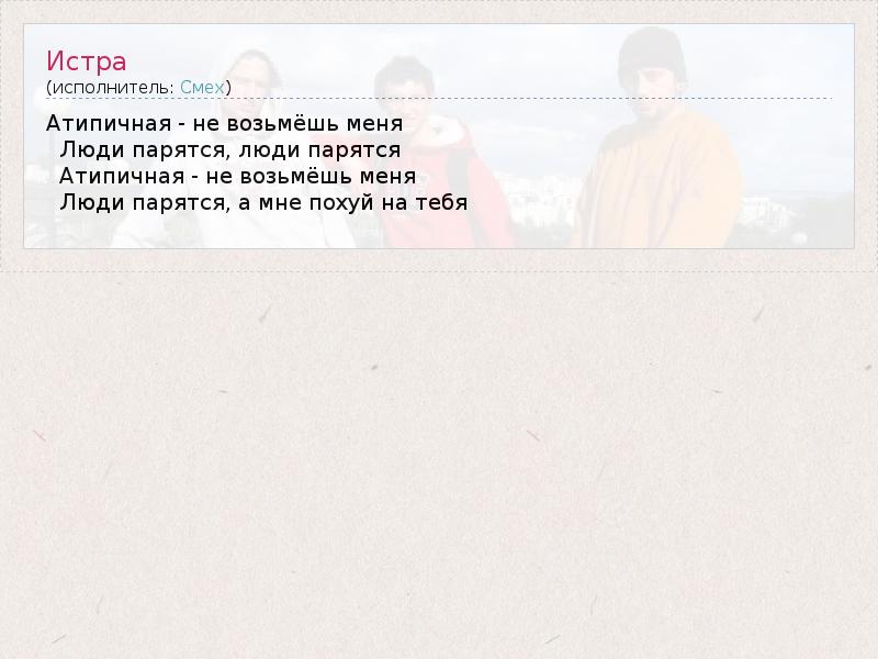 Это интересно:Группа СМЕХ была образована в 1999 году в г. Истра (Московской области) двумя братьями: Максимом (Грузин) и Сергеем (Чуп). Свой стиль СМЕХ называют «Калифорнистринский панк-рок», шутливо намекая на свой родной город, а также на своих кумиров из солнечной Калифорнии – NOFX и RANCID. Долгое время парни не могли найти себе подходящего барабанщика. Подходящего, не только по музыкальным качествам... продолжение