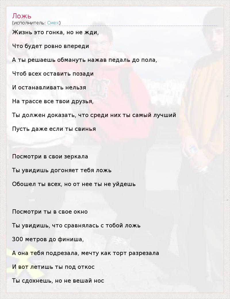 Жизнь это гонка, но не жди, Что будет ровно впереди А ты решаешь обмануть нажав педаль до пола, Чтоб всех оставить позади И останавливать нельзя На трассе все твои друзья, Ты должен доказать, что среди них ты самый лучший Пусть даже если ты свинья Посмотри в свои зеркала Ты увидишь догоняет тебя ложь Обошел ты всех, но от нее ты не уйдешь Посмотри ты в свое окно Ты увидишь, что сравнялась с тобой ложь 300 метров до финиша, А она тебя подрезала, мечту как торт разрезала И вот летишь ты под откос Ты сдохнешь, но не вешай нос