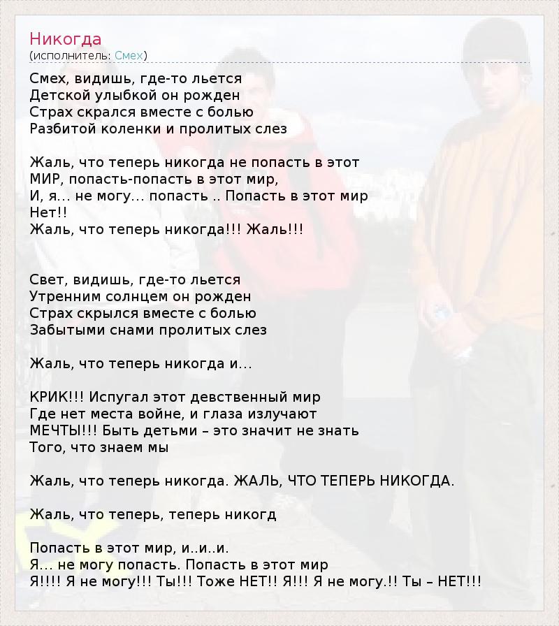 Cмех, видишь, где-то льется Детской улыбкой он рожден Страх скрался вместе с болью Разбитой коленки и пролитых слез Жаль, что теперь никогда не попасть в этот МИР, попасть-попасть в этот мир, И, я… не могу… попасть .. Попасть в этот мир Нет!! Жаль, что теперь никогда!!! Жаль!!! Свет, видишь, где-то льется Утренним солнцем он рожден Страх скрылся вместе с болью Забытыми снами пролитых слез Жаль, что теперь никогда и… КРИК!!! Испугал этот девственный мир Где нет места войне, и глаза излучают МЕЧТЫ!!! Быть детьми – это значит не знать Того, что знаем мы Жаль, что теперь никогда. ЖАЛЬ, ЧТО ТЕПЕРЬ НИКОГДА. Жаль, что теперь, теперь никогд Попасть в этот мир, и..и..и. Я… не могу попасть. Попасть в этот мир Я!!!! Я не могу!!! Ты!!! Тоже НЕТ!! Я!!! Я не могу.!! Ты – НЕТ!!!