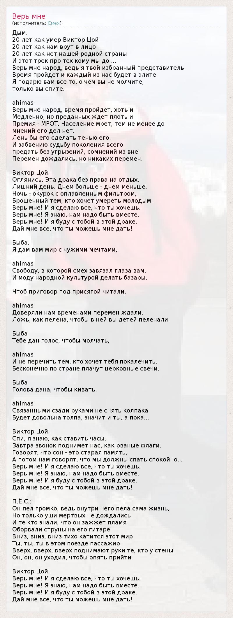 Дым: 20 лет как умер Виктор Цой 20 лет как нам врут в лицо 20 лет как нет нашей родной страны И этот трек про тех кому мы до ... Верь мне народ, ведь я твой избранный представитель. Время пройдет и каждый из нас будет в элите. Я подарю вам все то, о чем вы не молчите, только вы спите. ahimas Верь мне народ, время пройдет, хоть и Медленно, но преданных ждет плоть и Премия - МРОТ. Население мрет, тем не менее до мнений его дел нет. Лень бы его сделать тенью его. И забвению судьбу поколения всего предать без угрызений, сомнений из вне. Перемен дождались, но никаких перемен. Виктор Цой: Оглянись. Эта драка без права на отдых. Лишний день. Днем больше - днем меньше. Ночь - окурок с оплавленным фильтром, Брошенный тем, кто хочет умереть молодым. Верь мне! И я сделаю все, что ты хочешь. Верь мне! Я знаю, нам надо быть вместе. Верь мне! И я буду с тобой в этой драке. Дай мне все, что ты можешь мне дать! Быба: Я дам вам мир с чужими мечтами, ahimas Свободу, в которой смех завязал глаза вам. И моду народной культурой делать базары. Чтоб приговор под присягой читали, ahimas Доверяли нам временами перемен ждали. Ложь, как пелена, чтобы в ней вы детей пеленали. Быба Тебе дан голос, чтобы молчать, ahimas И не перечить тем, кто хочет тебя покалечить. Бесконечно по стране плачут церковные свечи. Быба Голова дана, чтобы кивать. ahimas Связанными сзади руками не снять колпака Будет довольна толпа, значит и ты, а пока... Виктор Цой: Спи, я знаю, как ставить часы. Завтра звонок поднимет нас, как рваные флаги. Говорят, что сон - это старая память, А потом нам говорят, что мы должны спать спокойно... Верь мне! И я сделаю все, что ты хочешь. Верь мне! Я знаю, нам надо быть вместе. Верь мне! И я буду с тобой в этой драке. Дай мне все, что ты можешь мне дать! П.Ё.С.: Он пел громко, ведь внутри него пела сама жизнь, Но только уши мертвых не дождались И те кто знали, что он зажжет пламя Оборвали струны на его гитаре Вниз, вниз, вниз тихо катится этот мир Ты, ты, ты в этом поезде пассажир Вверх, вверх, вверх поднимают руки те, кто у стены Он, он, он уходил, чтобы опять прийти Виктор Цой: Верь мне! И я сделаю все, что ты хочешь. Верь мне! Я знаю, нам надо быть вместе. Верь мне! И я буду с тобой в этой драке. Дай мне все, что ты можешь мне дать!