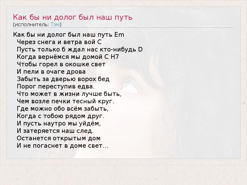 ГлавнаяИсполнителиТэмКак бы ни долог был наш путь