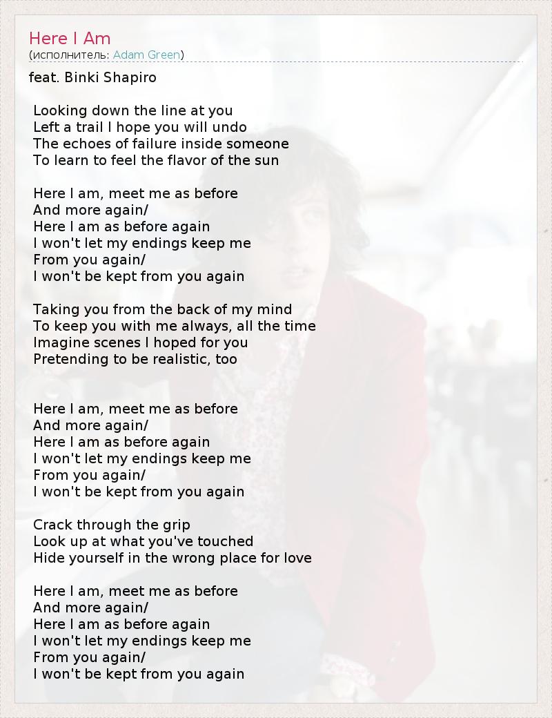 feat. Binki Shapiro Looking down the line at you Left a trail I hope you will undo The echoes of failure inside someone To learn to feel the flavor of the sun Here I am, meet me as before And more again/ Here I am as before again I won't let my endings keep me From you again/ I won't be kept from you again Taking you from the back of my mind To keep you with me always, all the time Imagine scenes I hoped for you Pretending to be realistic, too Here I am, meet me as before And more again/ Here I am as before again I won't let my endings keep me From you again/ I won't be kept from you again Crack through the grip Look up at what you've touched Hide yourself in the wrong place for love Here I am, meet me as before And more again/ Here I am as before again I won't let my endings keep me From you again/ I won't be kept from you again