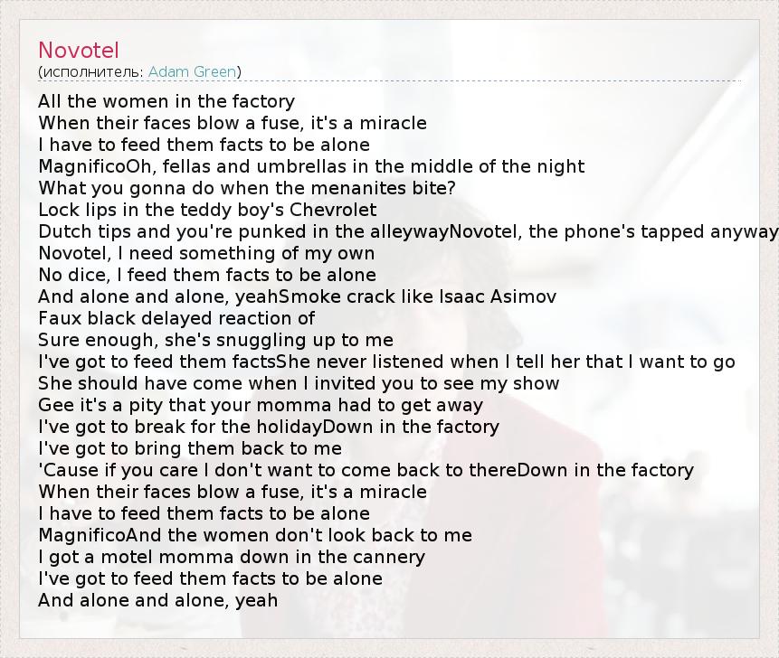 Это интересно:Adam Green. Основатель про-фолк группы The Moldy Peaches, ныне являющийся сольным артистом. Вскоре после её развала - один из идеологов ещё недавно новомодного (в начале 2000-ых) движения антифолк. Эдакой альтернативы всей этой около-экономической шумихе. Мягкого, без противодействия, противопоставления почти субкультуры реальности топ-менеджеров, кредитных линий, дорожных чеков, fast-food и fast-art (fast-movie,... продолжение