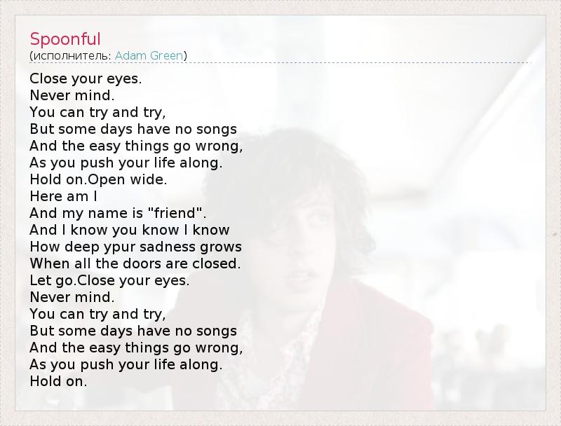 Close your eyes. Never mind. You can try and try, But some days have no songs And the easy things go wrong, As you push your life along. Hold on.Open wide. Here am I And my name is "friend". And I know you know I know How deep ypur sadness grows When all the doors are closed. Let go.Close your eyes. Never mind. You can try and try, But some days have no songs And the easy things go wrong, As you push your life along. Hold on.