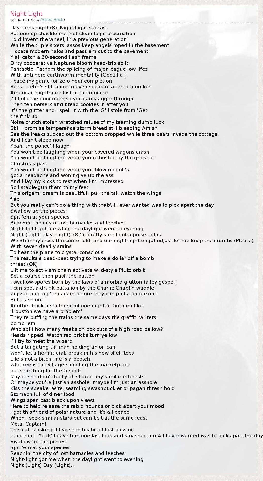 Day turns night (8x)Night Light suckas.. Put one up shackle me, not clean logic procreation I did invent the wheel, in a previous generation While the triple sixers lassos keep angels roped in the basement I locate modern halos and pass em out to the pavement Y'all catch a 30-second flash frame Dirty cooperative Neptune bloom head-trip split Fantastic! Fathom the splicing of major league low lifes With anti hero earthworm mentality (Godzilla!) I pace my game for zero hour completion See a cretin's still a cretin even speakin' altered moniker American nightmare lost in the monitor I'll hold the door open so you can stagger through Then ten berserk and bread cookies in after you It's the gutter and I spell it with the 'G' I stole from 'Get the f**k up' Noise crutch stolen wretched refuse of my teaming dumb luck Still I promise temperance storm breed still bleeding Amish See the freaks sucked out the bottom dropped while three bears invade the cottage And I can't sleep now Yeah, the police'll laugh You won't be laughing when your covered wagons crash You won't be laughing when you're hosted by the ghost of Christmas past You won't be laughing when your blow up doll's got a headache and won't give up the ass And I lay my kicks to rest when I'm impressed So I staple-gun them to my feet This origami dream is beautiful: pull the tail watch the wings flap But you really can't do a thing with thatAll I ever wanted was to pick apart the day Swallow up the pieces Spit 'em at your species Reachin' the city of lost barnacles and leeches Night-light got me when the daylight went to evening Night (Light) Day (Light) x8I'm pretty sure I got a pulse.. plus We Shimmy cross the centerfold, and our night light engulfedJust let me keep the crumbs (Please) With seven deadly stains To hear the plane to crystal conscious The results a dead-beat trying to make a dollar off a bomb threat (OK) Lift me to activism chain activate wild-style Pluto orbit Set a course then push the button I swallow spores born by the laws of a morbid glutton (alley gospel) I can spot a drunk battalion by the Charlie Chaplin waddle Zig zag and zig 'em again before they can pull a badge out But I lash out Another thick installment of one night in Gotham like 'Houston we have a problem' They're buffing the trains the same days the graffiti writers bomb 'em Who split how many freaks on box cuts of a high road bellow? Heads ripped! Watch red bricks turn yellow I'll try to meet the wizard But a tailgating tin-man holding an oil can won't let a hermit crab break in his new shell-toes Life's not a bitch, life is a beotch who keeps the villagers circling the marketplace out searching for the G-spot Maybe she didn't feel y'all shared any similar interests Or maybe you're just an asshole; maybe I'm just an asshole Kiss the speaker wire, seaming swashbuckler or pagan thresh hold Stomach full of diner food Wings span cast black upon views Here to help release the rabid hounds or pick apart your mood I got this friend of polar nature and it's all peace When I seek similar stars but can't sit at the same feast Metal Captain! This cat is asking if I've seen his bit of lost passion I told him: 'Yeah' I gave him one last look and smashed himAll I ever wanted was to pick apart the day Swallow up the pieces Spit 'em at your species Reachin' the city of lost barnacles and leeches Night-light got me when the daylight went to evening Night (Light) Day (Light)..