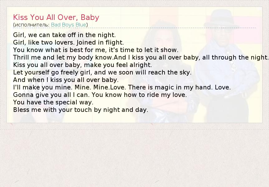 А как ты думаешь, о чем песня "Kiss You All Over, Baby" ?