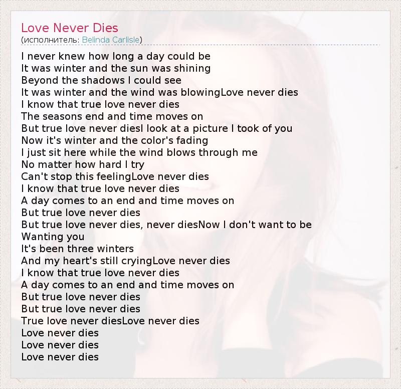 I never knew how long a day could be It was winter and the sun was shining Beyond the shadows I could see It was winter and the wind was blowingLove never dies I know that true love never dies The seasons end and time moves on But true love never diesI look at a picture I took of you Now it's winter and the color's fading I just sit here while the wind blows through me No matter how hard I try Can't stop this feelingLove never dies I know that true love never dies A day comes to an end and time moves on But true love never dies But true love never dies, never diesNow I don't want to be Wanting you It's been three winters And my heart's still cryingLove never dies I know that true love never dies A day comes to an end and time moves on But true love never dies But true love never dies True love never diesLove never dies Love never dies Love never dies Love never dies