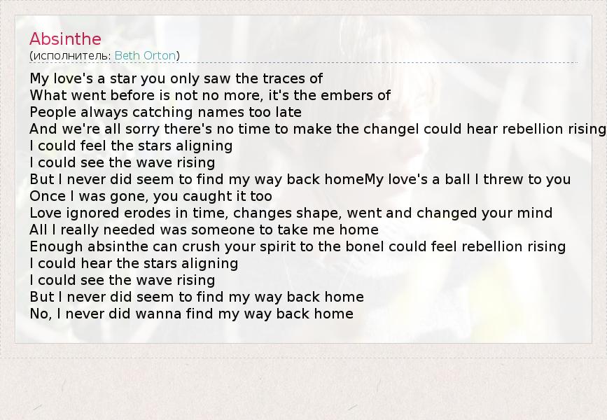 Enough absinthe can crush your spirit to the boneI could feel rebellion rising