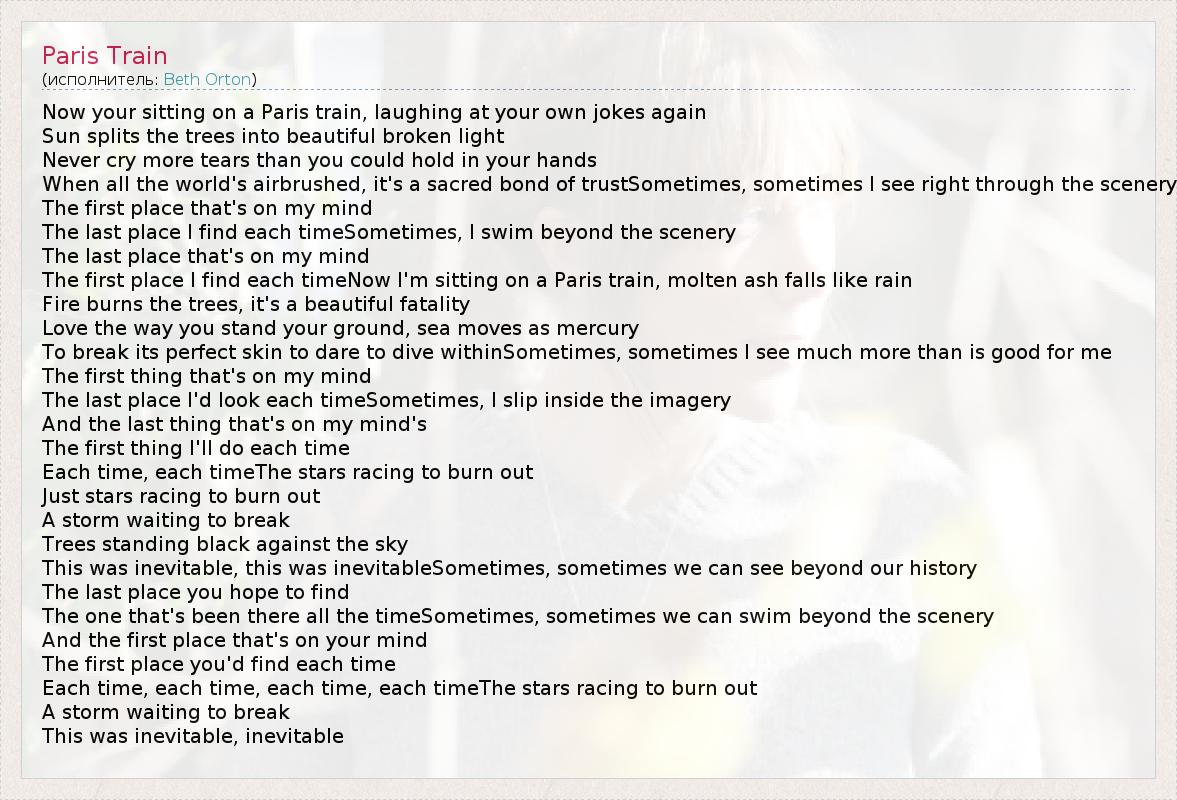 Now your sitting on a Paris train, laughing at your own jokes again Sun splits the trees into beautiful broken light Never cry more tears than you could hold in your hands When all the world's airbrushed, it's a sacred bond of trustSometimes, sometimes I see right through the scenery The first place that's on my mind The last place I find each timeSometimes, I swim beyond the scenery The last place that's on my mind The first place I find each timeNow I'm sitting on a Paris train, molten ash falls like rain Fire burns the trees, it's a beautiful fatality Love the way you stand your ground, sea moves as mercury To break its perfect skin to dare to dive withinSometimes, sometimes I see much more than is good for me The first thing that's on my mind The last place I'd look each timeSometimes, I slip inside the imagery And the last thing that's on my mind's The first thing I'll do each time Each time, each timeThe stars racing to burn out Just stars racing to burn out A storm waiting to break Trees standing black against the sky This was inevitable, this was inevitableSometimes, sometimes we can see beyond our history The last place you hope to find The one that's been there all the timeSometimes, sometimes we can swim beyond the scenery And the first place that's on your mind The first place you'd find each time Each time, each time, each time, each timeThe stars racing to burn out A storm waiting to break This was inevitable, inevitable