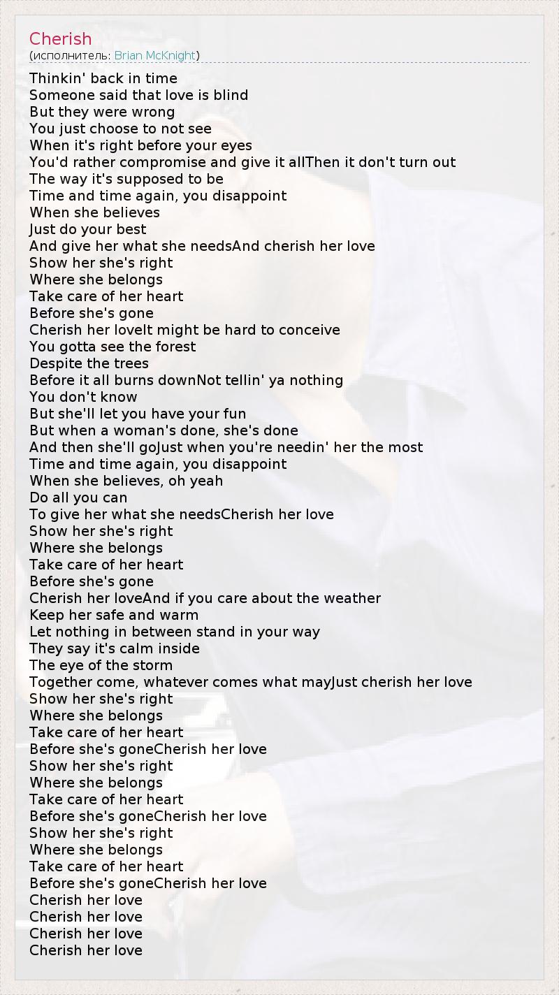 Это интересно:Брайан Макнайт - Возрождая Соул:"Я играю, я пою, но не я пляшу, я никого не зарезал и не подстрелил, и, в общем-то, мой голос звучит одинаково, как на пластинках, так и на концертах".Брайан Макнайт, вероятно, один из последних R'n'B-артистов 90-х годов прошлого века. За его карьеру длиной в пятнадцать лет он подарил нам такие баллады, как "One Last Cry", "Anytime" и побившим рекорды... продолжение