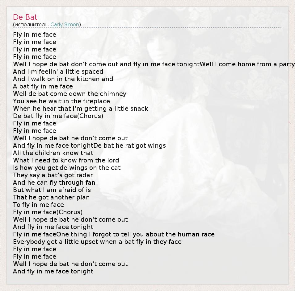 Well I hope de bat don't come out and fly in me face tonightWell I come home from a party
