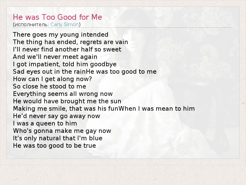 А как ты думаешь, о чем песня "He was Too Good for Me" ?