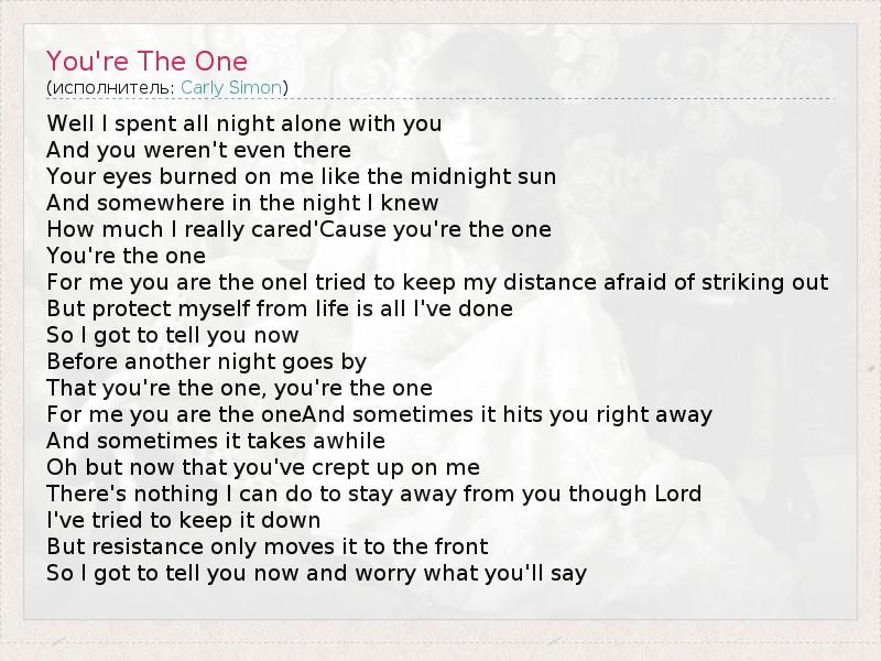 Well I spent all night alone with you And you weren't even there Your eyes burned on me like the midnight sun And somewhere in the night I knew How much I really cared'Cause you're the one You're the one For me you are the oneI tried to keep my distance afraid of striking out But protect myself from life is all I've done So I got to tell you now Before another night goes by That you're the one, you're the one For me you are the oneAnd sometimes it hits you right away And sometimes it takes awhile Oh but now that you've crept up on me There's nothing I can do to stay away from you though Lord I've tried to keep it down But resistance only moves it to the front So I got to tell you now and worry what you'll say