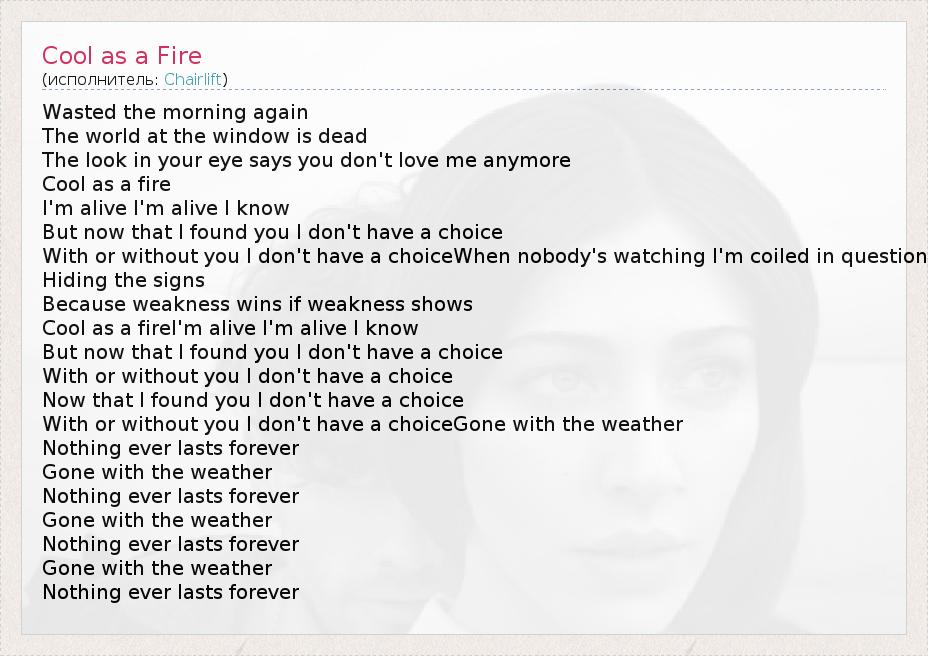 Wasted the morning again The world at the window is dead The look in your eye says you don't love me anymore Cool as a fire I'm alive I'm alive I know But now that I found you I don't have a choice With or without you I don't have a choiceWhen nobody's watching I'm coiled in question Hiding the signs Because weakness wins if weakness shows Cool as a fireI'm alive I'm alive I know But now that I found you I don't have a choice With or without you I don't have a choice Now that I found you I don't have a choice With or without you I don't have a choiceGone with the weather Nothing ever lasts forever Gone with the weather Nothing ever lasts forever Gone with the weather Nothing ever lasts forever Gone with the weather Nothing ever lasts forever