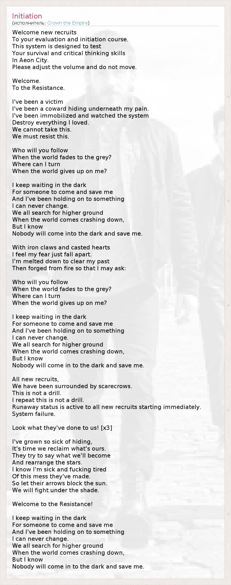 Это интересно:Crown The Empire - электроник пост-хардкор группа основанная в городе Даллас, Техас в 2010 году. "Crown The Empire задалась целью, что бы их фаны чувствовали себя особенными." Чаще всего произносит бас-гитарист Hayden. Группа состоит из 5 друзей, которые отправились в тур по стране и хотят пообщаться со всеми, для кого они пишут свою музыку. "Мы бы перестали расти как группа, если бы не преданные поклонники.... продолжение