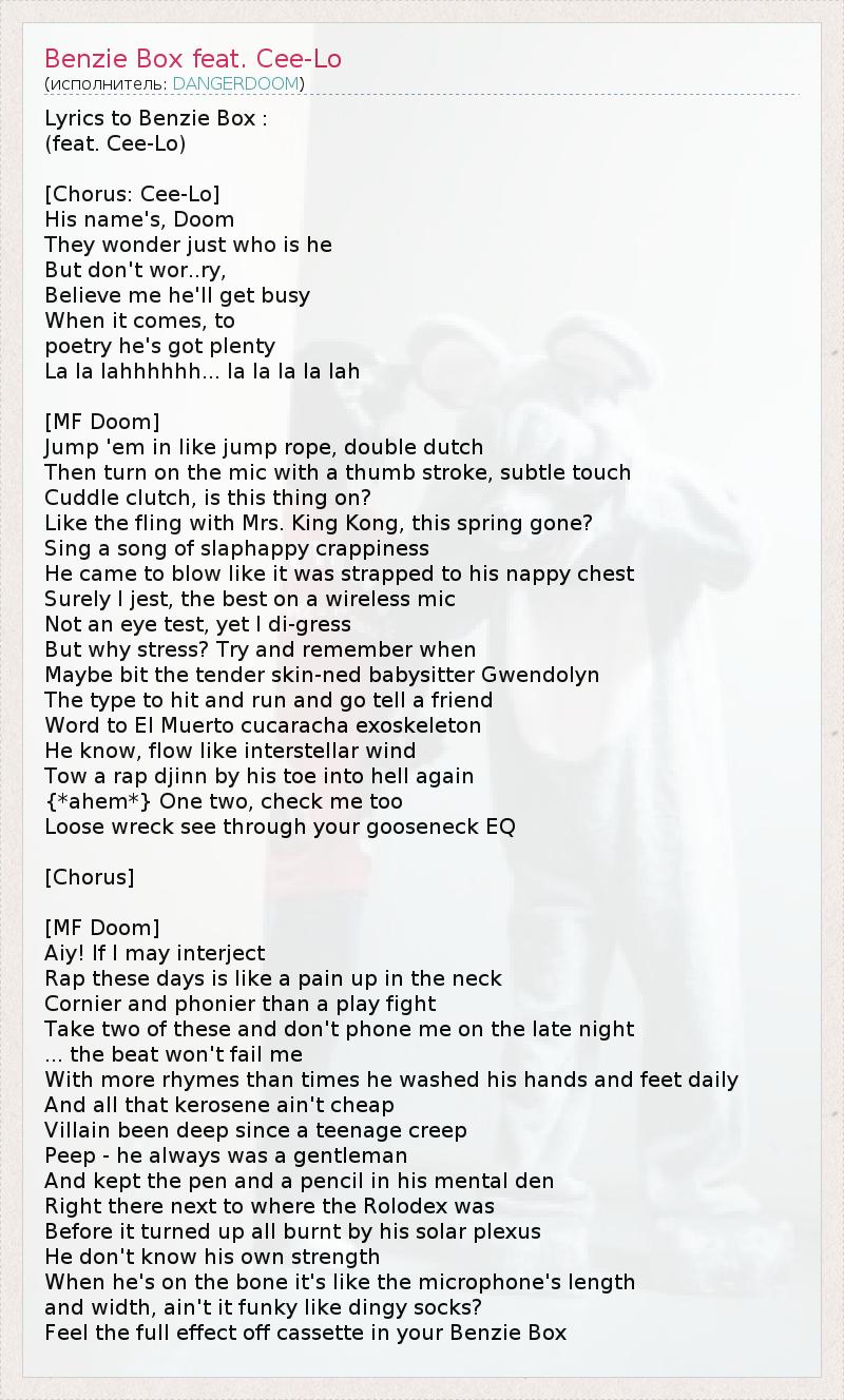 ГлавнаяИсполнителиDANGERDOOMBenzie Box feat. Cee-Lo