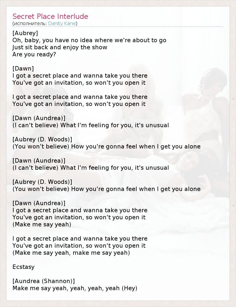 [Aubrey] Oh, baby, you have no idea where we're about to go Just sit back and enjoy the show Are you ready? [Dawn] I got a secret place and wanna take you there You've got an invitation, so won't you open it I got a secret place and wanna take you there You've got an invitation, so won't you open it [Dawn (Aundrea)] (I can't believe) What I'm feeling for you, it's unusual [Aubrey (D. Woods)] (You won't believe) How you're gonna feel when I get you alone [Dawn (Aundrea)] (I can't believe) What I'm feeling for you, it's unusual [Aubrey (D. Woods)] (You won't believe) How you're gonna feel when I get you alone [Dawn (Aundrea)] I got a secret place and wanna take you there You've got an invitation, so won't you open it (Make me say yeah) I got a secret place and wanna take you there You've got an invitation, so won't you open it (Make me say yeah, make me say yeah) Ecstasy [Aundrea (Shannon)] Make me say yeah, yeah, yeah, yeah (Hey)