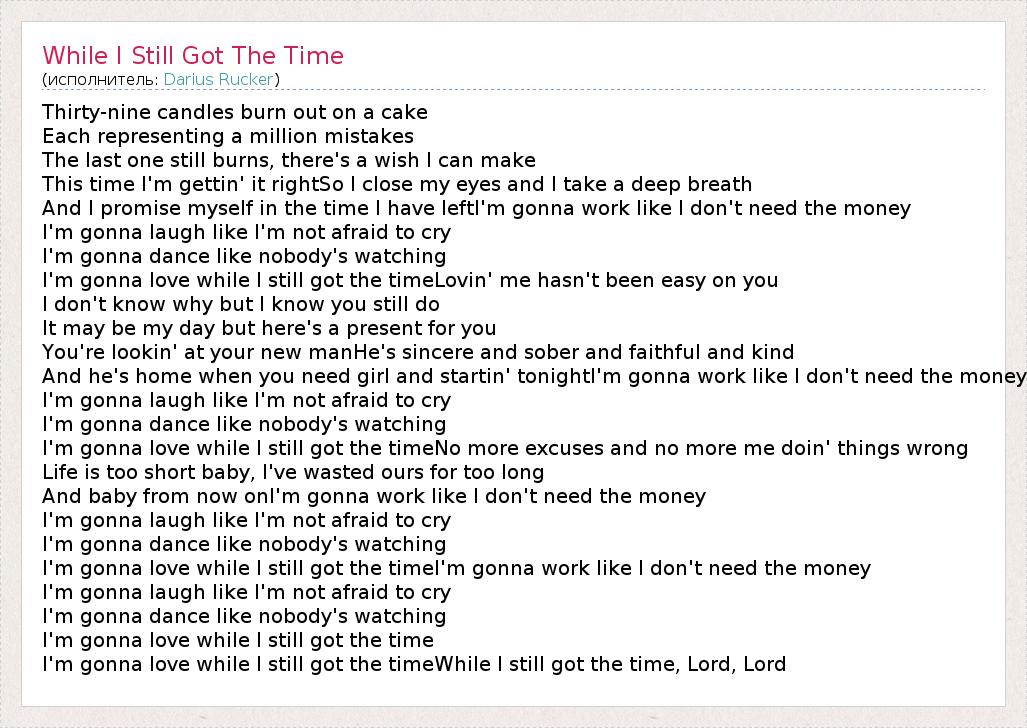 I'm gonna love while I still got the timeI'm gonna work like I don't need the money