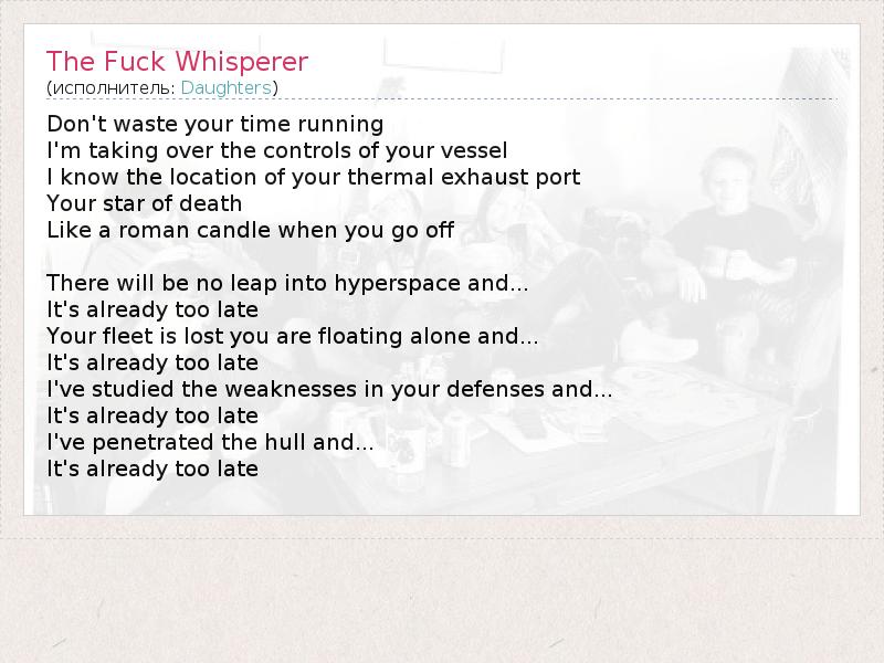 А как ты думаешь, о чем песня "The Fuck Whisperer" ?