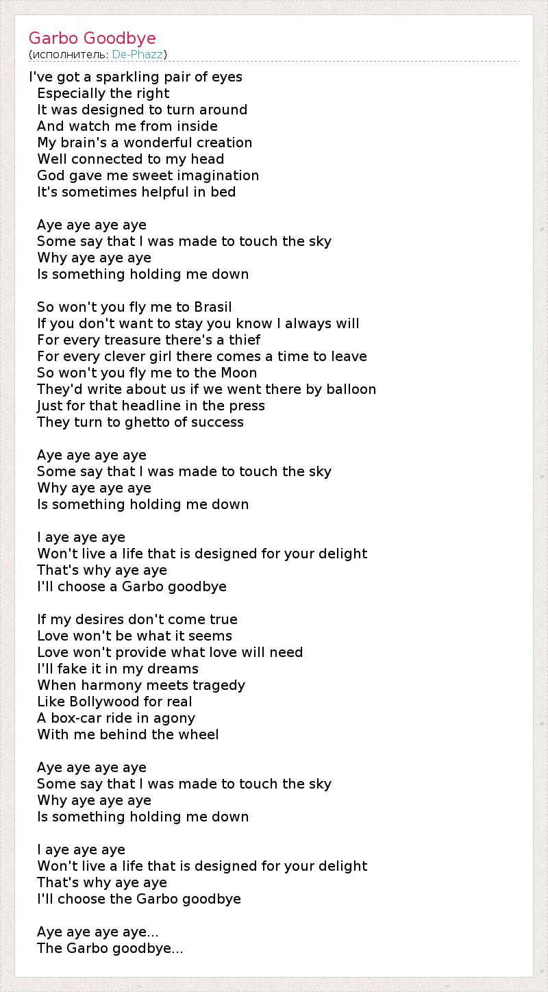 I've got a sparkling pair of eyes Especially the right It was designed to turn around And watch me from inside My brain's a wonderful creation Well connected to my head God gave me sweet imagination It's sometimes helpful in bed Aye aye aye aye Some say that I was made to touch the sky Why aye aye aye Is something holding me down So won't you fly me to Brasil If you don't want to stay you know I always will For every treasure there's a thief For every clever girl there comes a time to leave So won't you fly me to the Moon They'd write about us if we went there by balloon Just for that headline in the press They turn to ghetto of success Aye aye aye aye Some say that I was made to touch the sky Why aye aye aye Is something holding me down I aye aye aye Won't live a life that is designed for your delight That's why aye aye I'll choose a Garbo goodbye If my desires don't come true Love won't be what it seems Love won't provide what love will need I'll fake it in my dreams When harmony meets tragedy Like Bollywood for real A box-car ride in agony With me behind the wheel Aye aye aye aye Some say that I was made to touch the sky Why aye aye aye Is something holding me down I aye aye aye Won't live a life that is designed for your delight That's why aye aye I'll choose the Garbo goodbye Aye aye aye aye... The Garbo goodbye...