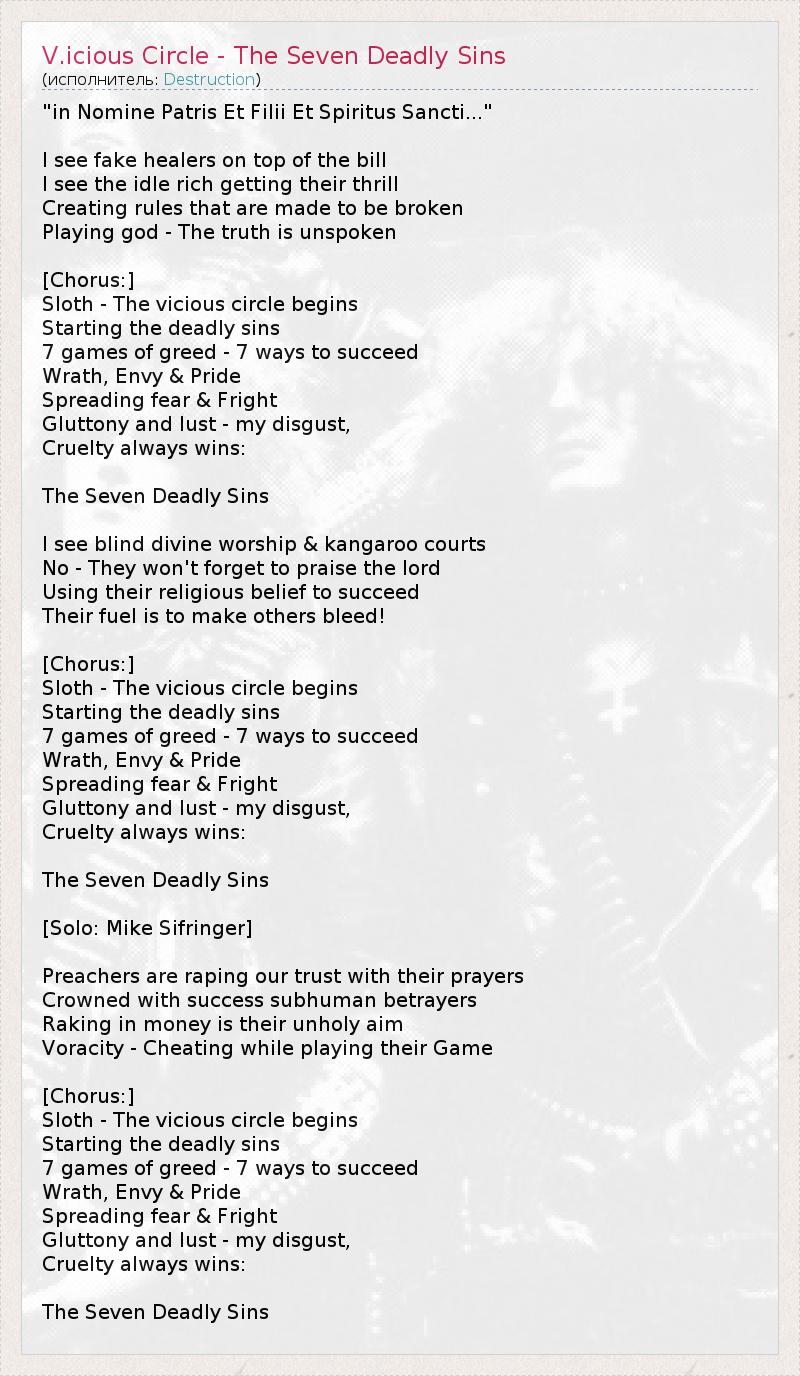 "in Nomine Patris Et Filii Et Spiritus Sancti..." I see fake healers on top of the bill I see the idle rich getting their thrill Creating rules that are made to be broken Playing god - The truth is unspoken [Chorus:] Sloth - The vicious circle begins Starting the deadly sins 7 games of greed - 7 ways to succeed Wrath, Envy & Pride Spreading fear & Fright Gluttony and lust - my disgust, Cruelty always wins: The Seven Deadly Sins I see blind divine worship & kangaroo courts No - They won't forget to praise the lord Using their religious belief to succeed Their fuel is to make others bleed! [Chorus:] Sloth - The vicious circle begins Starting the deadly sins 7 games of greed - 7 ways to succeed Wrath, Envy & Pride Spreading fear & Fright Gluttony and lust - my disgust, Cruelty always wins: The Seven Deadly Sins [Solo: Mike Sifringer] Preachers are raping our trust with their prayers Crowned with success subhuman betrayers Raking in money is their unholy aim Voracity - Cheating while playing their Game [Chorus:] Sloth - The vicious circle begins Starting the deadly sins 7 games of greed - 7 ways to succeed Wrath, Envy & Pride Spreading fear & Fright Gluttony and lust - my disgust, Cruelty always wins: The Seven Deadly Sins