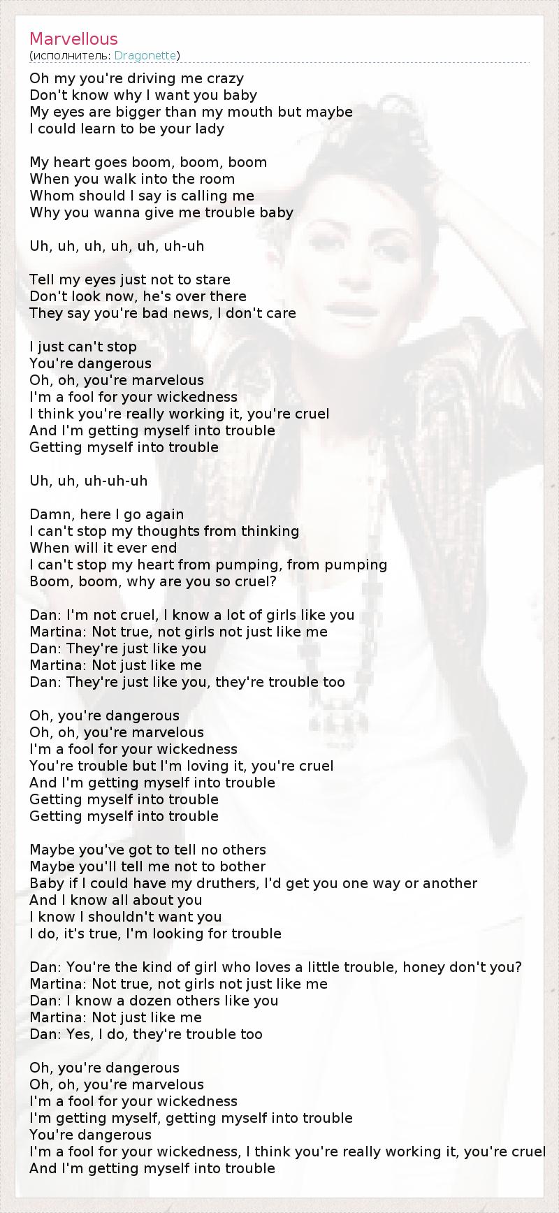 , ты сводишь меня с уму Не знаю почему, но я хочу тебя, малыш У меня глаза шире, чем рот, но может быть Я могла бы научиться быть твое леди Сердце стучит: «Бум, бум, бум» Когда ты входишь в комнату Кому сказать, что мне звонят Почему ты хочешь, чтобы я беспокоилась, малыш A, a, a, a, a, a-a Говорят мои глаза, только не смотреть Не смотри сейчас, он уже здесь Говорят, что ты – плохие новости, но мне всё равно Я уже не могу остановиться Ты опасен О, о, ты удивительный Я одурачена твоей порочностью Я думаю, ты действительно стараешься, ты жесток И я веду себя к беде Веду себя к беде A, a, a-a-a Чёрт, я снова за старое Я не могу прекратить думать Когда это прекратится Сердце колотится, я не могу это прекратить Бум, бум, почему ты так жесток? Дэн: Я не жесток, я знаю многих девушек, как ты Мартина: Не правда, я не такая, как они Дэн: Они точно такие же, как ты Мартина: Не как я Дэн: Они точно такие же, как ты, они тоже – беда О, ты опасен О, о, ты удивительный Я одурачена твоей порочностью Ты – беда, но я люблю это, ты жесток И я веду себя к беде Веду себя к беде Веду себя к беде Возможно, ты никому не должен говорить Возможно, ты скажешь мне, чтобы не беспокоить Малыш, если бы я могла выбирать, я выбрала бы тебя или другого И я знаю всё о тебе Я знаю, я не должна хотеть тебя Это так, это – правда, я ищу неприятности Дэн: Милая, ты из тех девушек, которые любят маленькие неприятности, не так ли? Мартина: Не правда, нет похожих на меня девушек Дэн: Я знаю дюжину похожих на тебя Мартина: Не похожи на меня Дэн: Да, похожи, они тоже – беда О, ты опасен О, о, ты удивительный Я одурачена твоей порочностью Я веду, веду себя к беде Ты опасен Я одурачена твоей порочностью, я думаю, ты действительно стараешься, ты жесток И я веду себя к беде