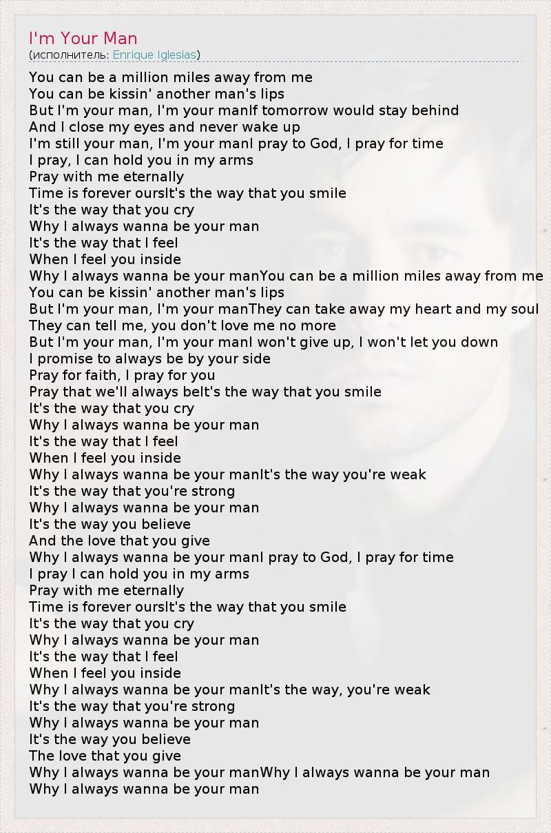 You can be a million miles away from me You can be kissin' another man's lips But I'm your man, I'm your manIf tomorrow would stay behind And I close my eyes and never wake up I'm still your man, I'm your manI pray to God, I pray for time I pray, I can hold you in my arms Pray with me eternally Time is forever oursIt's the way that you smile It's the way that you cry Why I always wanna be your man It's the way that I feel When I feel you inside Why I always wanna be your manYou can be a million miles away from me You can be kissin' another man's lips But I'm your man, I'm your manThey can take away my heart and my soul They can tell me, you don't love me no more But I'm your man, I'm your manI won't give up, I won't let you down I promise to always be by your side Pray for faith, I pray for you Pray that we'll always beIt's the way that you smile It's the way that you cry Why I always wanna be your man It's the way that I feel When I feel you inside Why I always wanna be your manIt's the way you're weak It's the way that you're strong Why I always wanna be your man It's the way you believe And the love that you give Why I always wanna be your manI pray to God, I pray for time I pray I can hold you in my arms Pray with me eternally Time is forever oursIt's the way that you smile It's the way that you cry Why I always wanna be your man It's the way that I feel When I feel you inside Why I always wanna be your manIt's the way, you're weak It's the way that you're strong Why I always wanna be your man It's the way you believe The love that you give Why I always wanna be your manWhy I always wanna be your man Why I always wanna be your man