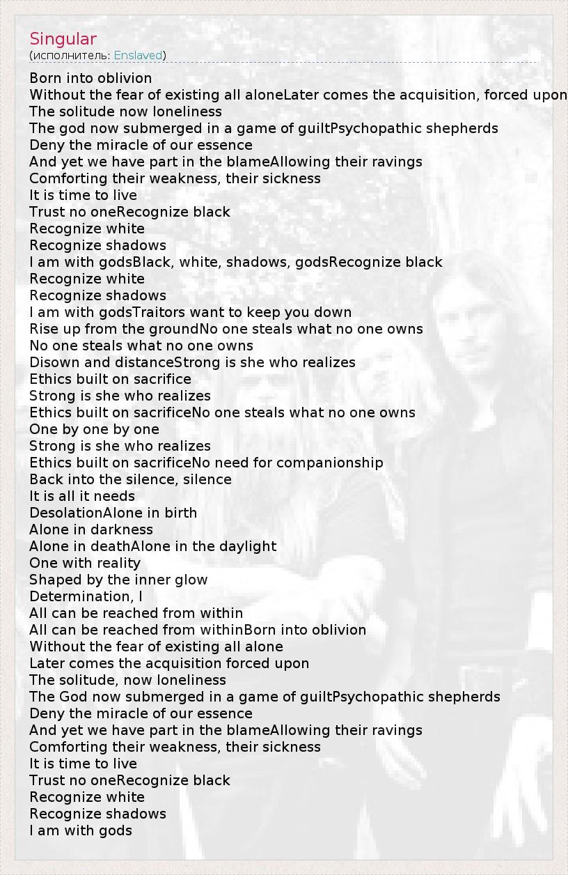 Born into oblivion Without the fear of existing all aloneLater comes the acquisition, forced upon The solitude now loneliness The god now submerged in a game of guiltPsychopathic shepherds Deny the miracle of our essence And yet we have part in the blameAllowing their ravings Comforting their weakness, their sickness It is time to live Trust no oneRecognize black Recognize white Recognize shadows I am with godsBlack, white, shadows, godsRecognize black Recognize white Recognize shadows I am with godsTraitors want to keep you down Rise up from the groundNo one steals what no one owns No one steals what no one owns Disown and distanceStrong is she who realizes Ethics built on sacrifice Strong is she who realizes Ethics built on sacrificeNo one steals what no one owns One by one by one Strong is she who realizes Ethics built on sacrificeNo need for companionship Back into the silence, silence It is all it needs DesolationAlone in birth Alone in darkness Alone in deathAlone in the daylight One with reality Shaped by the inner glow Determination, I All can be reached from within All can be reached from withinBorn into oblivion Without the fear of existing all alone Later comes the acquisition forced upon The solitude, now loneliness The God now submerged in a game of guiltPsychopathic shepherds Deny the miracle of our essence And yet we have part in the blameAllowing their ravings Comforting their weakness, their sickness It is time to live Trust no oneRecognize black Recognize white Recognize shadows I am with gods