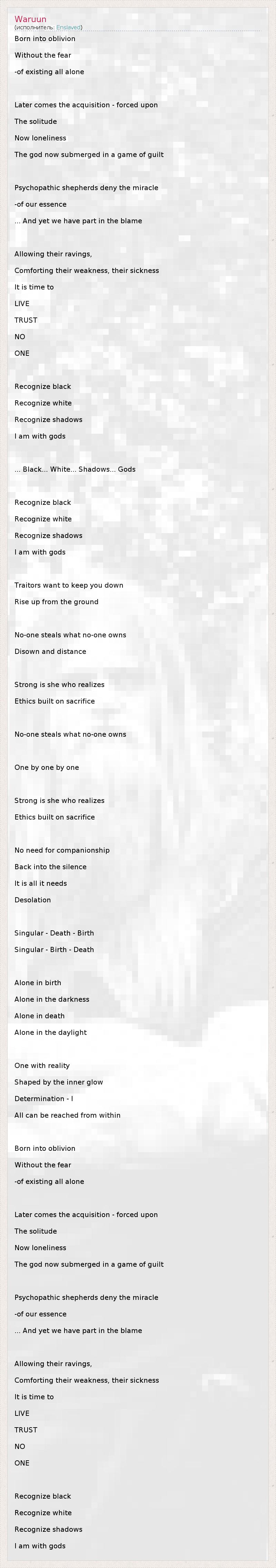 Born into oblivion Without the fear -of existing all alone Later comes the acquisition - forced upon The solitude Now loneliness The god now submerged in a game of guilt Psychopathic shepherds deny the miracle -of our essence ... And yet we have part in the blame Allowing their ravings, Comforting their weakness, their sickness It is time to LIVE TRUST NO ONE Recognize black Recognize white Recognize shadows I am with gods ... Black... White... Shadows... Gods Recognize black Recognize white Recognize shadows I am with gods Traitors want to keep you down Rise up from the ground No-one steals what no-one owns Disown and distance Strong is she who realizes Ethics built on sacrifice No-one steals what no-one owns One by one by one Strong is she who realizes Ethics built on sacrifice No need for companionship Back into the silence It is all it needs Desolation Singular - Death - Birth Singular - Birth - Death Alone in birth Alone in the darkness Alone in death Alone in the daylight One with reality Shaped by the inner glow Determination - I All can be reached from within Born into oblivion Without the fear -of existing all alone Later comes the acquisition - forced upon The solitude Now loneliness The god now submerged in a game of guilt Psychopathic shepherds deny the miracle -of our essence ... And yet we have part in the blame Allowing their ravings, Comforting their weakness, their sickness It is time to LIVE TRUST NO ONE Recognize black Recognize white Recognize shadows I am with gods