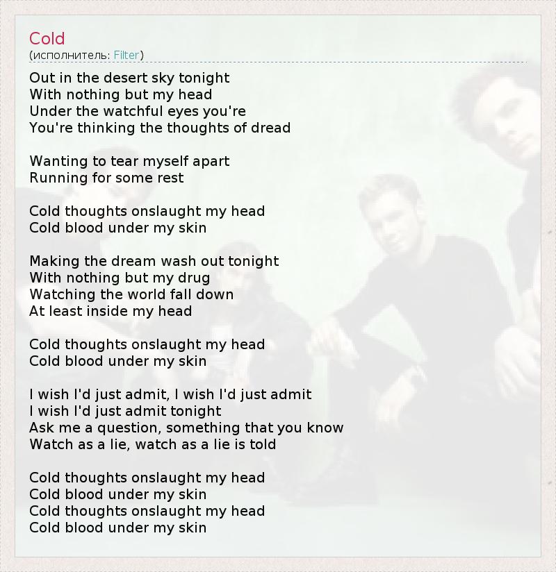 Это интересно:Американский индастриал-проект "Filter" появился на свет в виде дуэта: Брайан Лайзгэнг (программинг, гитара, клавишные, ударные) и Ричард Патрик (вокал, гитара, бас, программинг, ударные), игравший в свое время в Nine Inch Nails. Пока Патрик проводил эксперименты в восьмидорожечной студии в своем родном Кливленде, Лэйзгэнг получал философскую степень в чикагском университете и параллельно... продолжение