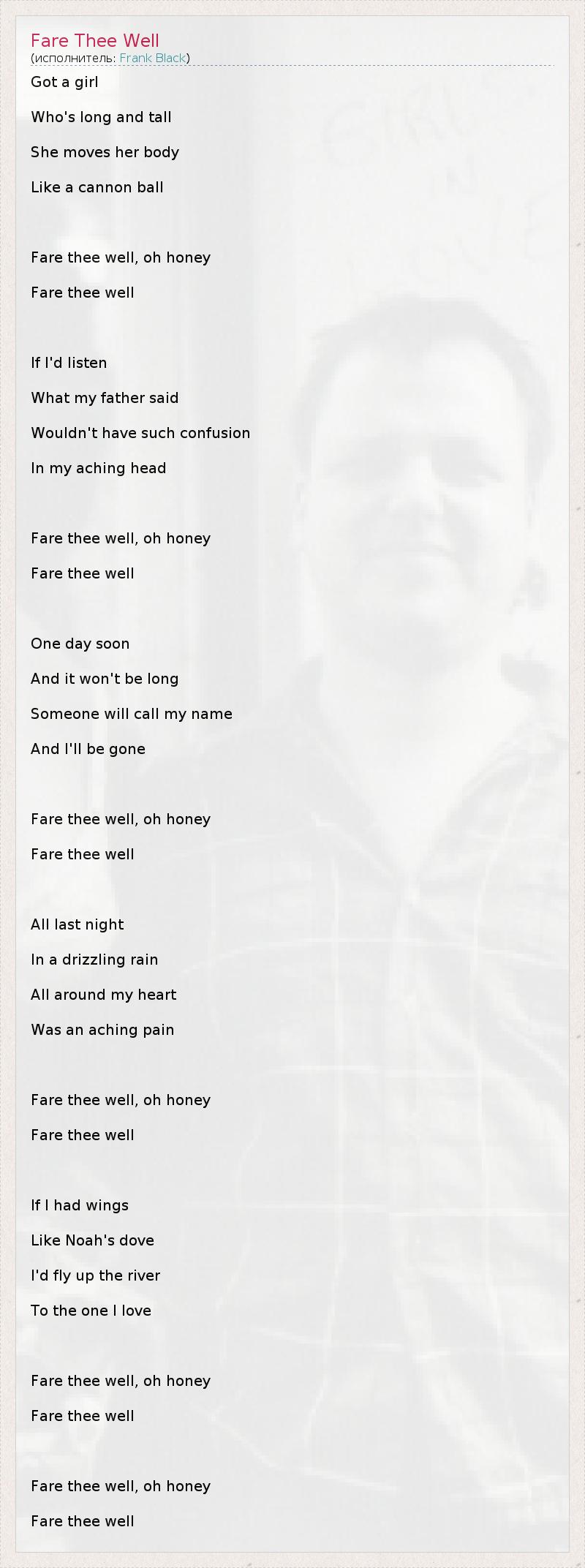 Got a girl Who's long and tall She moves her body Like a cannon ball Fare thee well, oh honey Fare thee well If I'd listen What my father said Wouldn't have such confusion In my aching head Fare thee well, oh honey Fare thee well One day soon And it won't be long Someone will call my name And I'll be gone Fare thee well, oh honey Fare thee well All last night In a drizzling rain All around my heart Was an aching pain Fare thee well, oh honey Fare thee well If I had wings Like Noah's dove I'd fly up the river To the one I love Fare thee well, oh honey Fare thee well Fare thee well, oh honey Fare thee well