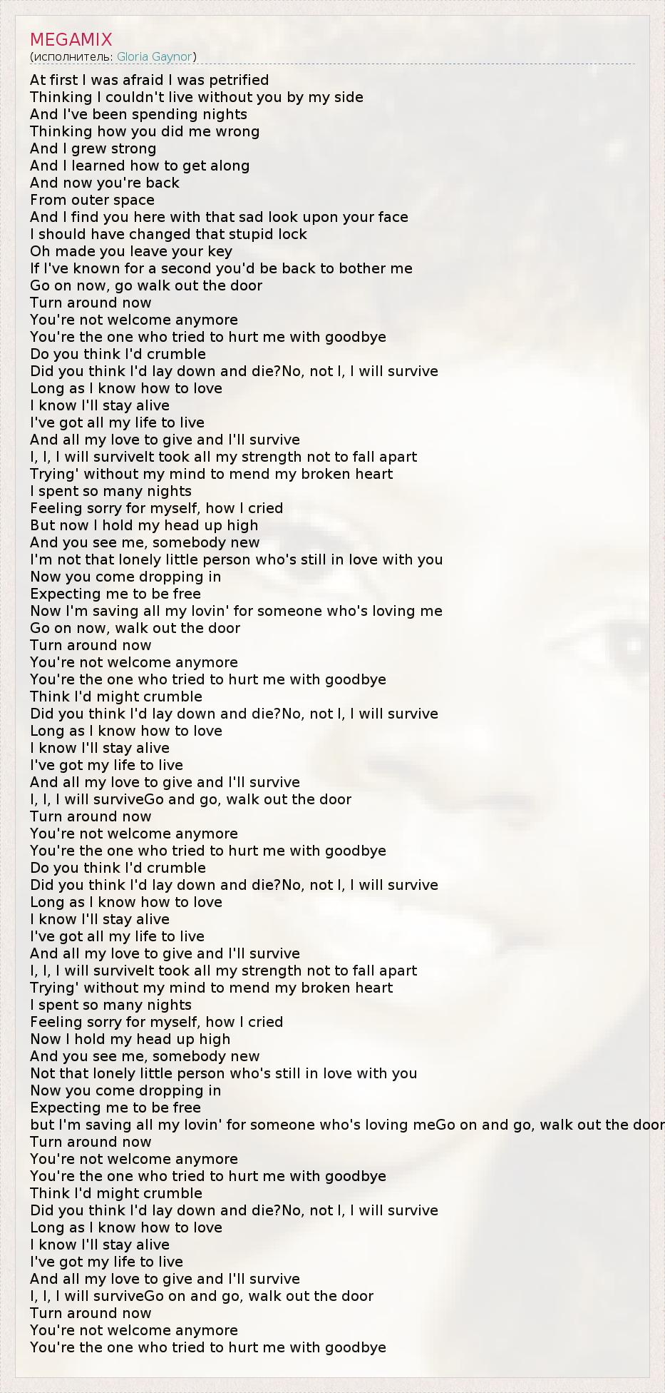 Это интересно:Глория Гейнор (англ. Gloria Gaynor, настоящее имя Gloria Fowles — Глория Фаулз; род. 7 сентября 1949) — американская певица в стиле диско, известная своими хитами «I Will Survive» и «Never Can Say Goodbye». БиографияГлория родилась в Ньюарке, штат Нью-Джерси. В 1960-е годы она стала выступать с группой «Soul Satisfiers», а в 1965 году вышел её первый сольный сингл «She'll Be Sorry/Let Me Go Baby».Первый большой успех к ней пришёл... продолжение