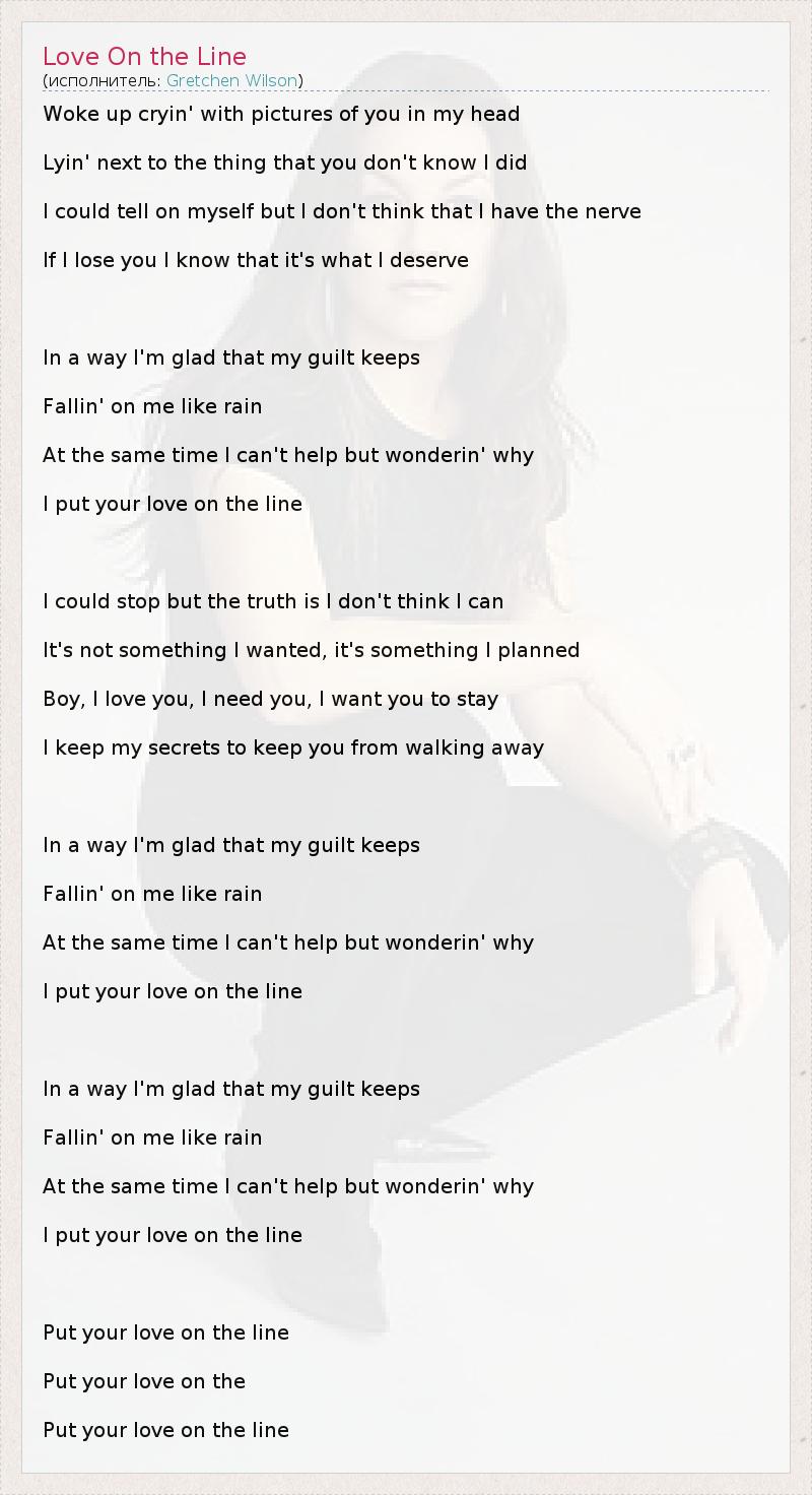Woke up cryin' with pictures of you in my head Lyin' next to the thing that you don't know I did I could tell on myself but I don't think that I have the nerve If I lose you I know that it's what I deserve In a way I'm glad that my guilt keeps Fallin' on me like rain At the same time I can't help but wonderin' why I put your love on the line I could stop but the truth is I don't think I can It's not something I wanted, it's something I planned Boy, I love you, I need you, I want you to stay I keep my secrets to keep you from walking away In a way I'm glad that my guilt keeps Fallin' on me like rain At the same time I can't help but wonderin' why I put your love on the line In a way I'm glad that my guilt keeps Fallin' on me like rain At the same time I can't help but wonderin' why I put your love on the line Put your love on the line Put your love on the Put your love on the line