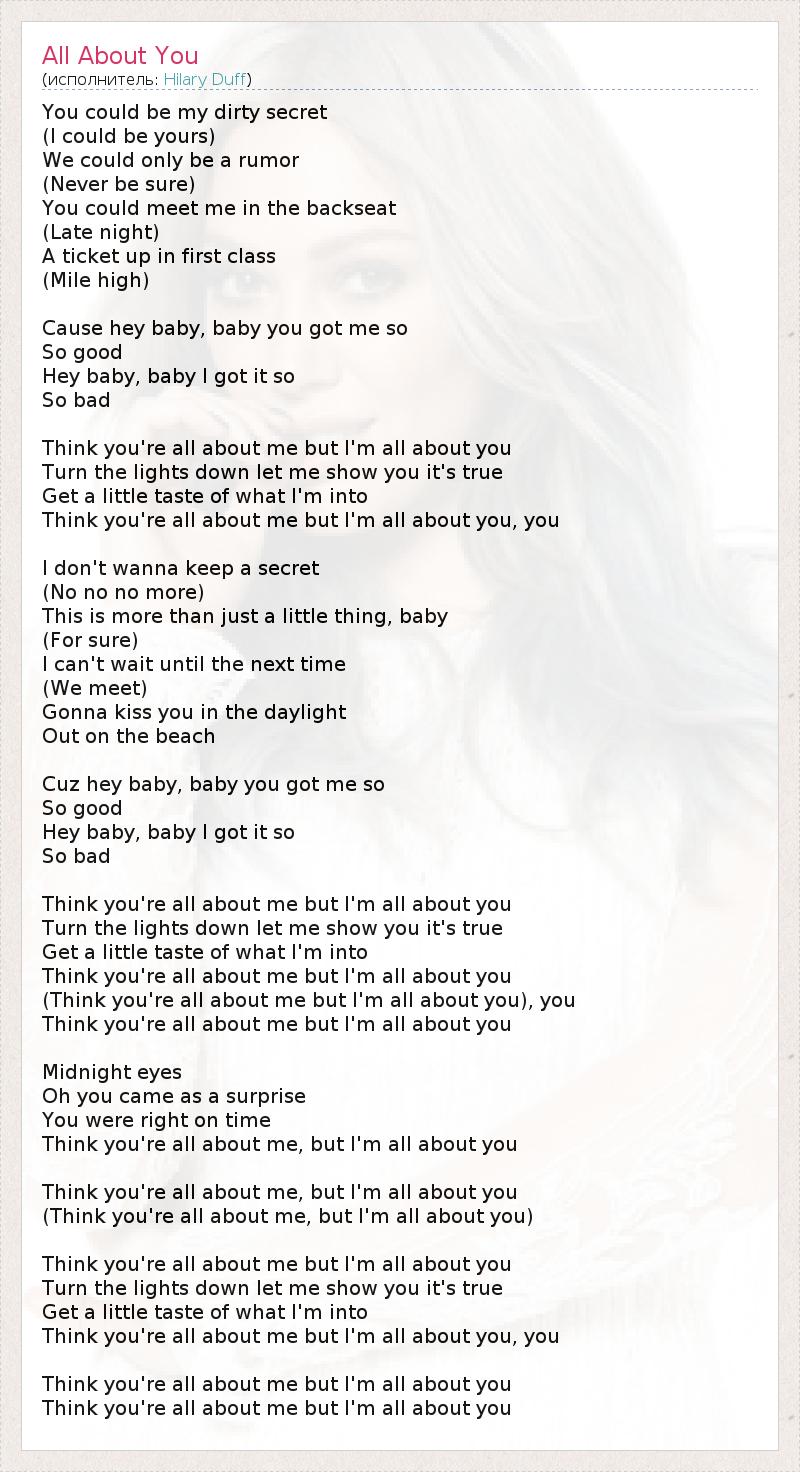 You could be my dirty secret (I could be yours) We could only be a rumor (Never be sure) You could meet me in the backseat (Late night) A ticket up in first class (Mile high) Cause hey baby, baby you got me so So good Hey baby, baby I got it so So bad Think you're all about me but I'm all about you Turn the lights down let me show you it's true Get a little taste of what I'm into Think you're all about me but I'm all about you, you I don't wanna keep a secret (No no no more) This is more than just a little thing, baby (For sure) I can't wait until the next time (We meet) Gonna kiss you in the daylight Out on the beach Cuz hey baby, baby you got me so So good Hey baby, baby I got it so So bad Think you're all about me but I'm all about you Turn the lights down let me show you it's true Get a little taste of what I'm into Think you're all about me but I'm all about you (Think you're all about me but I'm all about you), you Think you're all about me but I'm all about you Midnight eyes Oh you came as a surprise You were right on time Think you're all about me, but I'm all about you Think you're all about me, but I'm all about you (Think you're all about me, but I'm all about you) Think you're all about me but I'm all about you Turn the lights down let me show you it's true Get a little taste of what I'm into Think you're all about me but I'm all about you, you Think you're all about me but I'm all about you Think you're all about me but I'm all about you