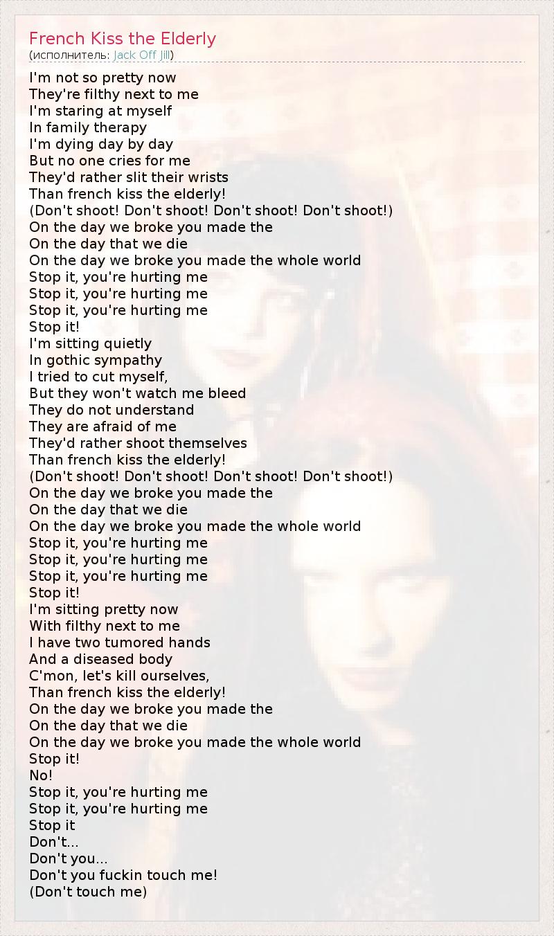 I'm not so pretty now They're filthy next to me I'm staring at myself In family therapy I'm dying day by day But no one cries for me They'd rather slit their wrists Than french kiss the elderly! (Don't shoot! Don't shoot! Don't shoot! Don't shoot!) On the day we broke you made the On the day that we die On the day we broke you made the whole world Stop it, you're hurting me Stop it, you're hurting me Stop it, you're hurting me Stop it! I'm sitting quietly In gothic sympathy I tried to cut myself, But they won't watch me bleed They do not understand They are afraid of me They'd rather shoot themselves Than french kiss the elderly! (Don't shoot! Don't shoot! Don't shoot! Don't shoot!) On the day we broke you made the On the day that we die On the day we broke you made the whole world Stop it, you're hurting me Stop it, you're hurting me Stop it, you're hurting me Stop it! I'm sitting pretty now With filthy next to me I have two tumored hands And a diseased body C'mon, let's kill ourselves, Than french kiss the elderly! On the day we broke you made the On the day that we die On the day we broke you made the whole world Stop it! No! Stop it, you're hurting me Stop it, you're hurting me Stop it Don't... Don't you... Don't you fuckin touch me! (Don't touch me)