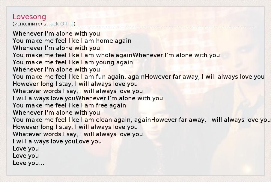 Whenever I'm alone with you You make me feel like I am home again Whenever I'm alone with you You make me feel like I am whole againWhenever I'm alone with you You make me feel like I am young again Whenever I'm alone with you You make me feel like I am fun again, againHowever far away, I will always love you However long I stay, I will always love you Whatever words I say, I will always love you I will always love youWhenever I'm alone with you You make me feel like I am free again Whenever I'm alone with you You make me feel like I am clean again, againHowever far away, I will always love you However long I stay, I will always love you Whatever words I say, I will always love you I will always love youLove you Love you Love you Love you...