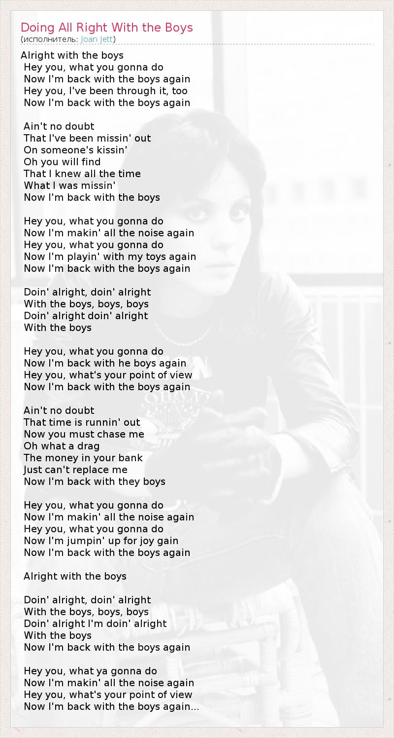 Alright with the boys Hey you, what you gonna do Now I'm back with the boys again Hey you, I've been through it, too Now I'm back with the boys again Ain't no doubt That I've been missin' out On someone's kissin' Oh you will find That I knew all the time What I was missin' Now I'm back with the boys Hey you, what you gonna do Now I'm makin' all the noise again Hey you, what you gonna do Now I'm playin' with my toys again Now I'm back with the boys again Doin' alright, doin' alright With the boys, boys, boys Doin' alright doin' alright With the boys Hey you, what you gonna do Now I'm back with he boys again Hey you, what's your point of view Now I'm back with the boys again Ain't no doubt That time is runnin' out Now you must chase me Oh what a drag The money in your bank Just can't replace me Now I'm back with they boys Hey you, what you gonna do Now I'm makin' all the noise again Hey you, what you gonna do Now I'm jumpin' up for joy gain Now I'm back with the boys again Alright with the boys Doin' alright, doin' alright With the boys, boys, boys Doin' alright I'm doin' alright With the boys Now I'm back with the boys again Hey you, what ya gonna do Now I'm makin' all the noise again Hey you, what's your point of view Now I'm back with the boys again...