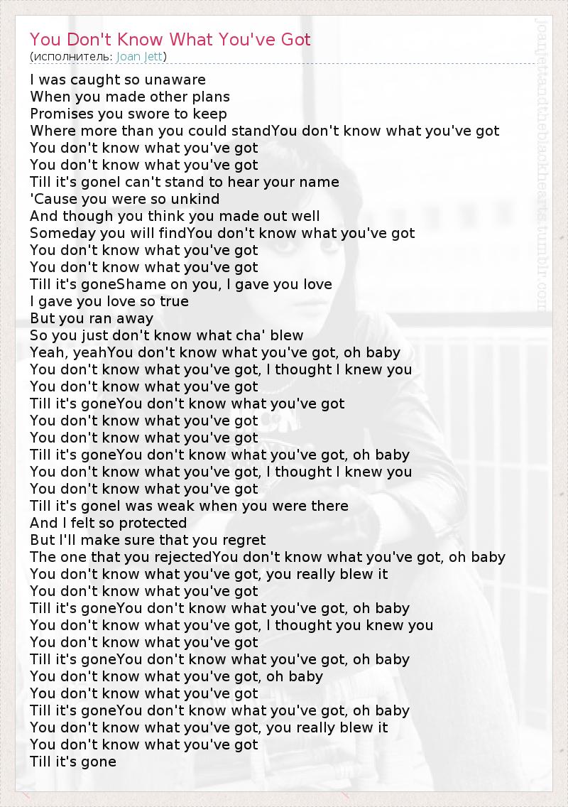 I was caught so unaware When you made other plans Promises you swore to keep Where more than you could standYou don't know what you've got You don't know what you've got You don't know what you've got Till it's goneI can't stand to hear your name 'Cause you were so unkind And though you think you made out well Someday you will findYou don't know what you've got You don't know what you've got You don't know what you've got Till it's goneShame on you, I gave you love I gave you love so true But you ran away So you just don't know what cha' blew Yeah, yeahYou don't know what you've got, oh baby You don't know what you've got, I thought I knew you You don't know what you've got Till it's goneYou don't know what you've got You don't know what you've got You don't know what you've got Till it's goneYou don't know what you've got, oh baby You don't know what you've got, I thought I knew you You don't know what you've got Till it's goneI was weak when you were there And I felt so protected But I'll make sure that you regret The one that you rejectedYou don't know what you've got, oh baby You don't know what you've got, you really blew it You don't know what you've got Till it's goneYou don't know what you've got, oh baby You don't know what you've got, I thought you knew you You don't know what you've got Till it's goneYou don't know what you've got, oh baby You don't know what you've got, oh baby You don't know what you've got Till it's goneYou don't know what you've got, oh baby You don't know what you've got, you really blew it You don't know what you've got Till it's gone