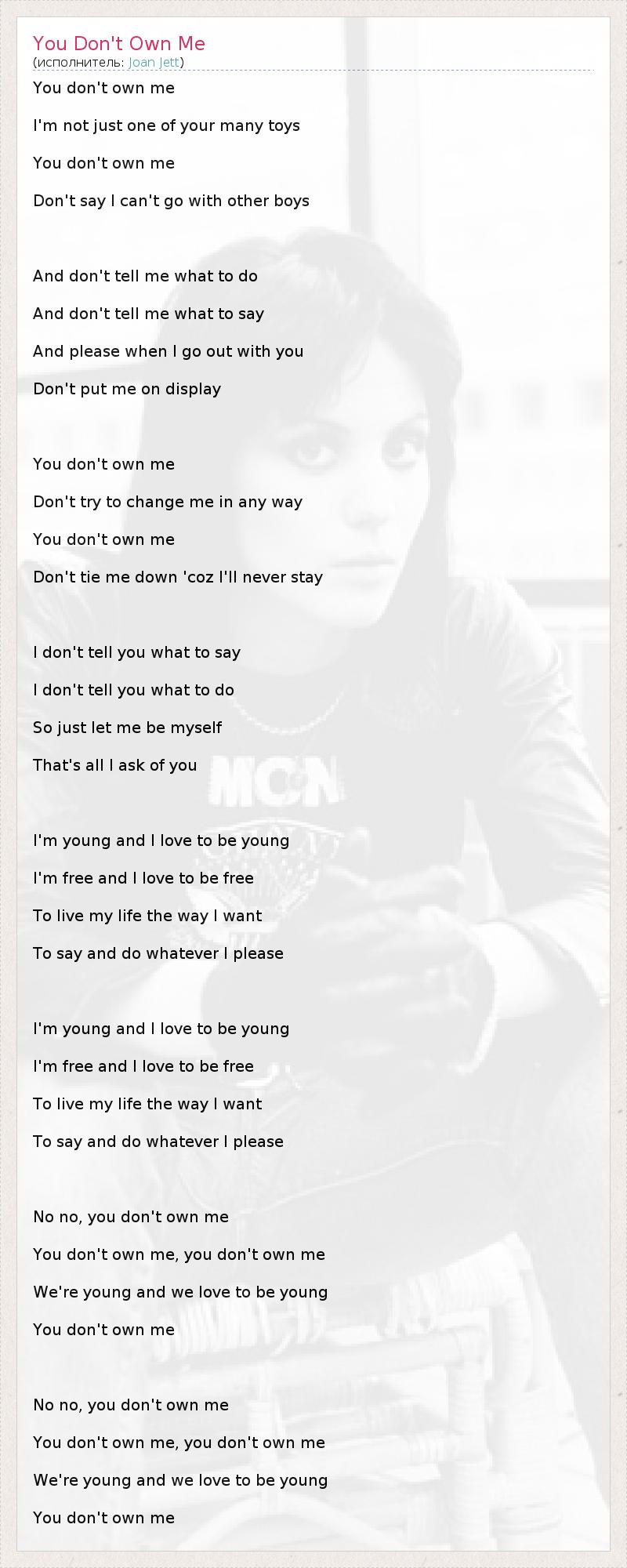 You don't own me I'm not just one of your many toys You don't own me Don't say I can't go with other boys And don't tell me what to do And don't tell me what to say And please when I go out with you Don't put me on display You don't own me Don't try to change me in any way You don't own me Don't tie me down 'coz I'll never stay I don't tell you what to say I don't tell you what to do So just let me be myself That's all I ask of you I'm young and I love to be young I'm free and I love to be free To live my life the way I want To say and do whatever I please I'm young and I love to be young I'm free and I love to be free To live my life the way I want To say and do whatever I please No no, you don't own me You don't own me, you don't own me We're young and we love to be young You don't own me No no, you don't own me You don't own me, you don't own me We're young and we love to be young You don't own me