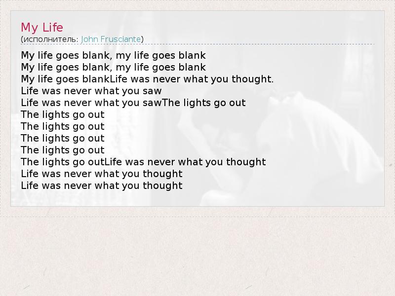 My life goes blank, my life goes blank My life goes blank, my life goes blank My life goes blankLife was never what you thought. Life was never what you saw Life was never what you sawThe lights go out The lights go out The lights go out The lights go out The lights go out The lights go outLife was never what you thought Life was never what you thought Life was never what you thought