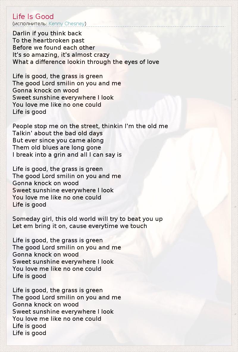 Darlin if you think back To the heartbroken past Before we found each other It's so amazing, it's almost crazy What a difference lookin through the eyes of love Life is good, the grass is green The good Lord smilin on you and me Gonna knock on wood Sweet sunshine everywhere I look You love me like no one could Life is good People stop me on the street, thinkin I'm the old me Talkin' about the bad old days But ever since you came along Them old blues are long gone I break into a grin and all I can say is Life is good, the grass is green The good Lord smilin on you and me Gonna knock on wood Sweet sunshine everywhere I look You love me like no one could Life is good Someday girl, this old world will try to beat you up Let em bring it on, cause everytime we touch Life is good, the grass is green The good Lord smilin on you and me Gonna knock on wood Sweet sunshine everywhere I look You love me like no one could Life is good Life is good, the grass is green The good Lord smilin on you and me Gonna knock on wood Sweet sunshine everywhere I look You love me like no one could Life is good Life is good