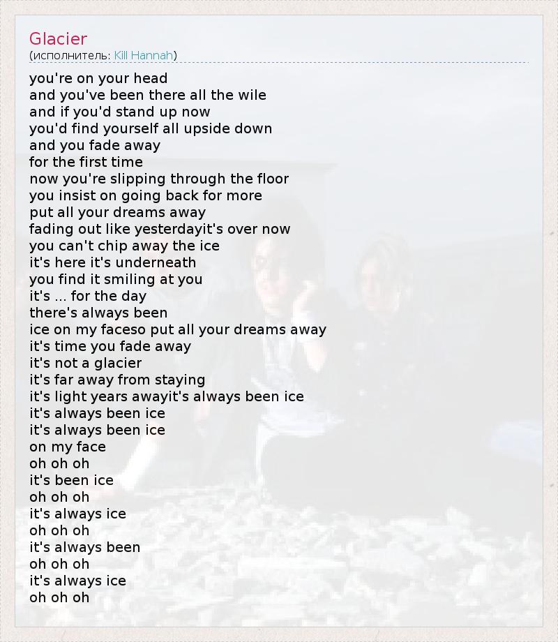 you're on your head and you've been there all the wile and if you'd stand up now you'd find yourself all upside down and you fade away for the first time now you're slipping through the floor you insist on going back for more put all your dreams away fading out like yesterdayit's over now you can't chip away the ice it's here it's underneath you find it smiling at you it's ... for the day there's always been ice on my faceso put all your dreams away it's time you fade away it's not a glacier it's far away from staying it's light years awayit's always been ice it's always been ice it's always been ice on my face oh oh oh it's been ice oh oh oh it's always ice oh oh oh it's always been oh oh oh it's always ice oh oh oh