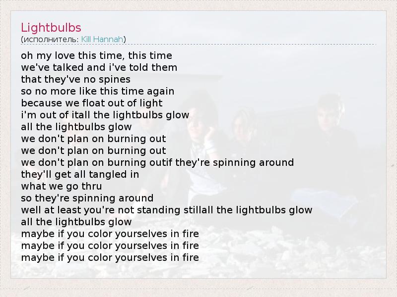 oh my love this time, this time we've talked and i've told them that they've no spines so no more like this time again because we float out of light i'm out of itall the lightbulbs glow all the lightbulbs glow we don't plan on burning out we don't plan on burning out we don't plan on burning outif they're spinning around they'll get all tangled in what we go thru so they're spinning around well at least you're not standing stillall the lightbulbs glow all the lightbulbs glow maybe if you color yourselves in fire maybe if you color yourselves in fire maybe if you color yourselves in fire