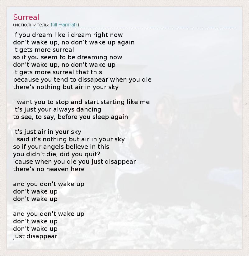 if you dream like i dream right now don't wake up, no don't wake up again it gets more surreal so if you seem to be dreaming now don't wake up, no don't wake up it gets more surreal that this because you tend to dissapear when you die there's nothing but air in your sky i want you to stop and start starting like me it's just your always dancing to see, to say, before you sleep again it's just air in your sky i said it's nothing but air in your sky so if your angels believe in this you didn't die, did you quit? 'cause when you die you just disappear there's no heaven here and you don't wake up don't wake up don't wake up and you don't wake up don't wake up don't wake up just disappear