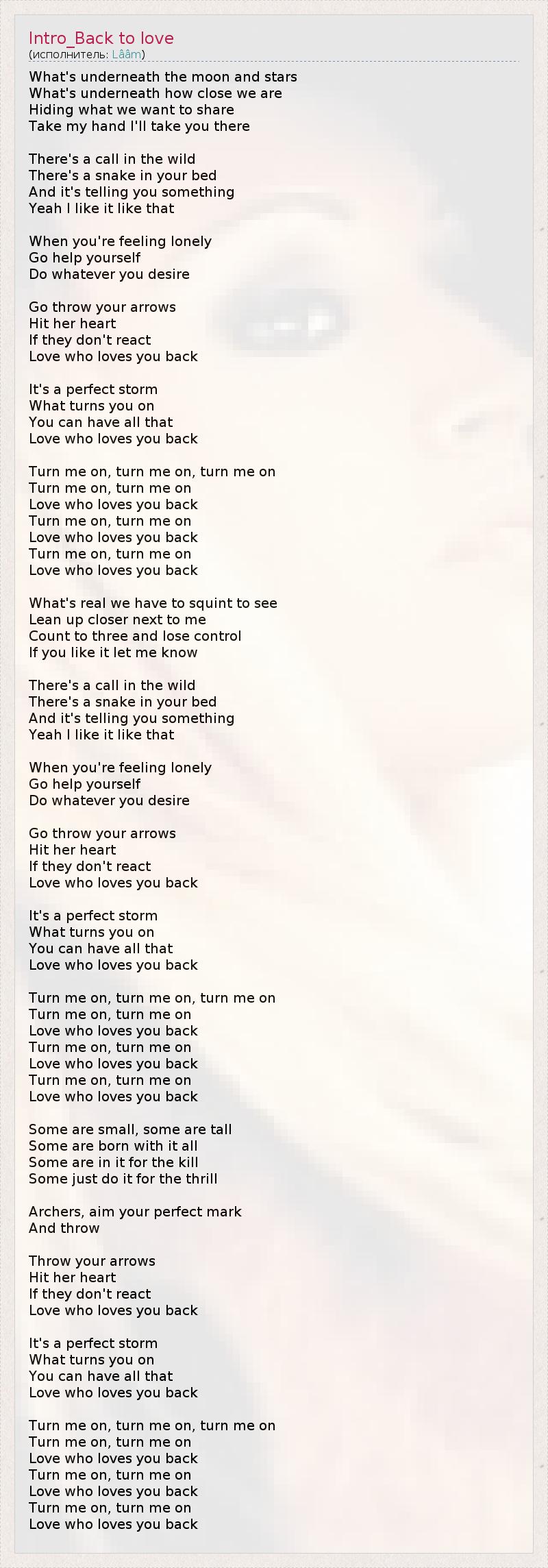 What's underneath the moon and stars What's underneath how close we are Hiding what we want to share Take my hand I'll take you there There's a call in the wild There's a snake in your bed And it's telling you something Yeah I like it like that When you're feeling lonely Go help yourself Do whatever you desire Go throw your arrows Hit her heart If they don't react Love who loves you back It's a perfect storm What turns you on You can have all that Love who loves you back Turn me on, turn me on, turn me on Turn me on, turn me on Love who loves you back Turn me on, turn me on Love who loves you back Turn me on, turn me on Love who loves you back What's real we have to squint to see Lean up closer next to me Count to three and lose control If you like it let me know There's a call in the wild There's a snake in your bed And it's telling you something Yeah I like it like that When you're feeling lonely Go help yourself Do whatever you desire Go throw your arrows Hit her heart If they don't react Love who loves you back It's a perfect storm What turns you on You can have all that Love who loves you back Turn me on, turn me on, turn me on Turn me on, turn me on Love who loves you back Turn me on, turn me on Love who loves you back Turn me on, turn me on Love who loves you back Some are small, some are tall Some are born with it all Some are in it for the kill Some just do it for the thrill Archers, aim your perfect mark And throw Throw your arrows Hit her heart If they don't react Love who loves you back It's a perfect storm What turns you on You can have all that Love who loves you back Turn me on, turn me on, turn me on Turn me on, turn me on Love who loves you back Turn me on, turn me on Love who loves you back Turn me on, turn me on Love who loves you back