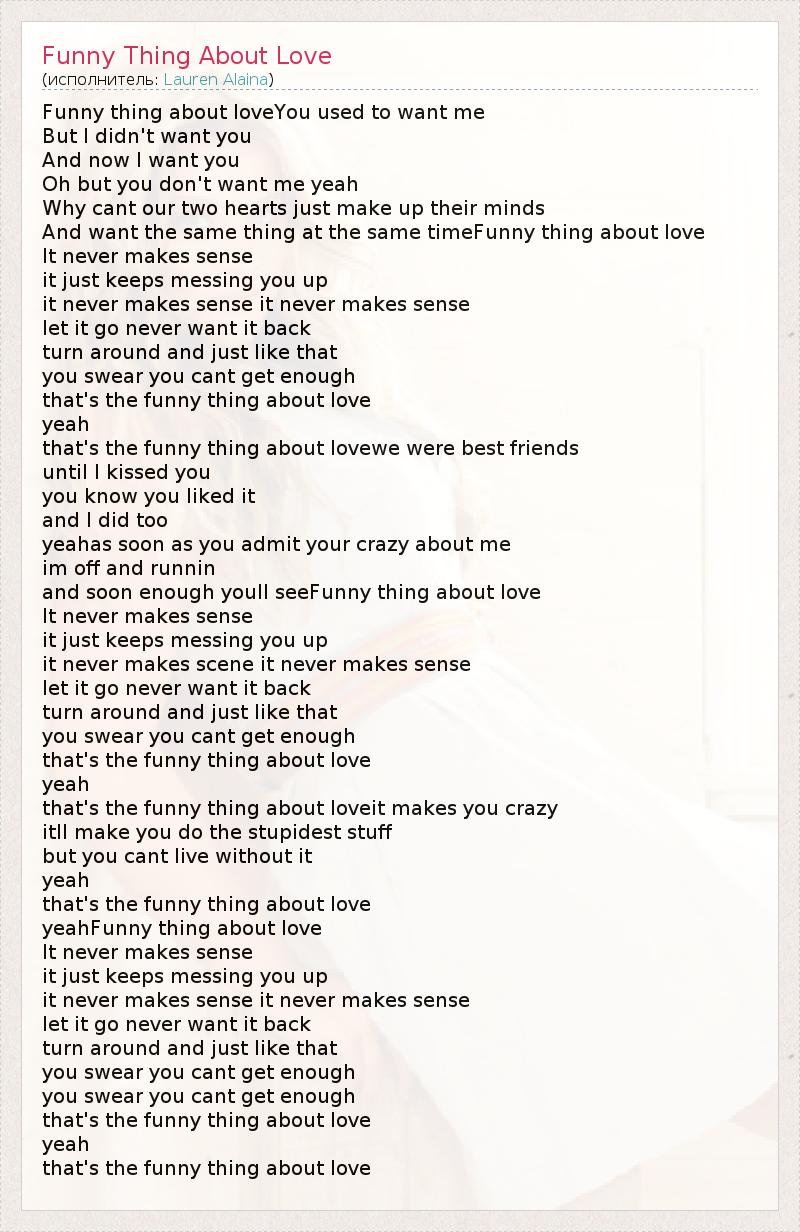 Funny thing about loveYou used to want me But I didn't want you And now I want you Oh but you don't want me yeah Why cant our two hearts just make up their minds And want the same thing at the same timeFunny thing about love It never makes sense it just keeps messing you up it never makes sense it never makes sense let it go never want it back turn around and just like that you swear you cant get enough that's the funny thing about love yeah that's the funny thing about lovewe were best friends until I kissed you you know you liked it and I did too yeahas soon as you admit your crazy about me im off and runnin and soon enough youll seeFunny thing about love It never makes sense it just keeps messing you up it never makes scene it never makes sense let it go never want it back turn around and just like that you swear you cant get enough that's the funny thing about love yeah that's the funny thing about loveit makes you crazy itll make you do the stupidest stuff but you cant live without it yeah that's the funny thing about love yeahFunny thing about love It never makes sense it just keeps messing you up it never makes sense it never makes sense let it go never want it back turn around and just like that you swear you cant get enough you swear you cant get enough that's the funny thing about love yeah that's the funny thing about love