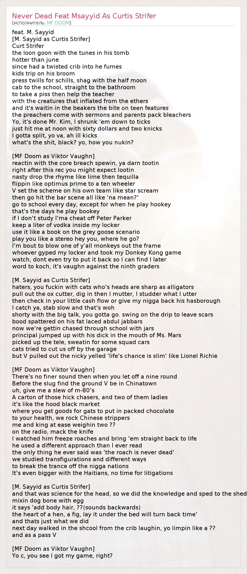 ГлавнаяИсполнителиMF DOOMNever Dead Feat Msayyid As Curtis Strifer